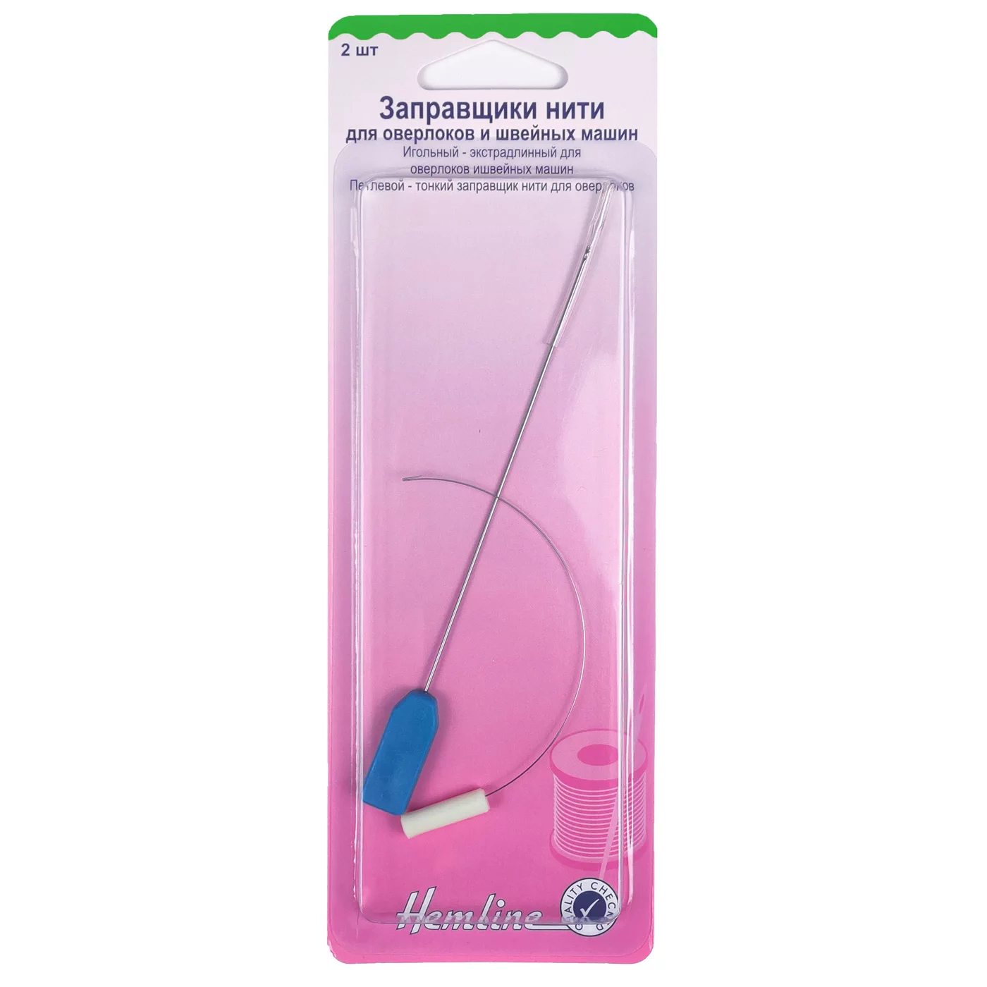 В наборе два типа заправщиков нити: ИГОЛЬНЫЙ - экстрадлинный для оверлоков и швейных машин; ПЕТЛЕВОЙ - тонкий заправщик нити для оверлоков.
