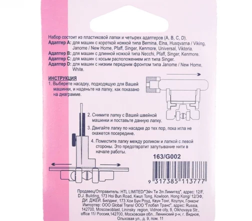Адаптер А - для машин с короткой ножкой типа Bernina, Elna, Husqvarna / Viking, Janome / New Home, Pfaff, Singer, Kenmore, Universal, Viktoria.