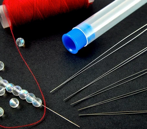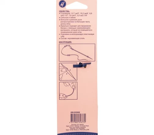 5 распространенных размеров: 12,7/10,2/8,9/7,6/5,8 см. Прочные и гибкие. Большое и длинное ушко, занимающее большую часть длины иглы. Идеально подходит для продевания бисера с помощью нанизывающего материала, который не помещается в традиционное игольное ушко. Многоразовый пластиковый футляр. Материал содержимого: нержавеющая сталь.
