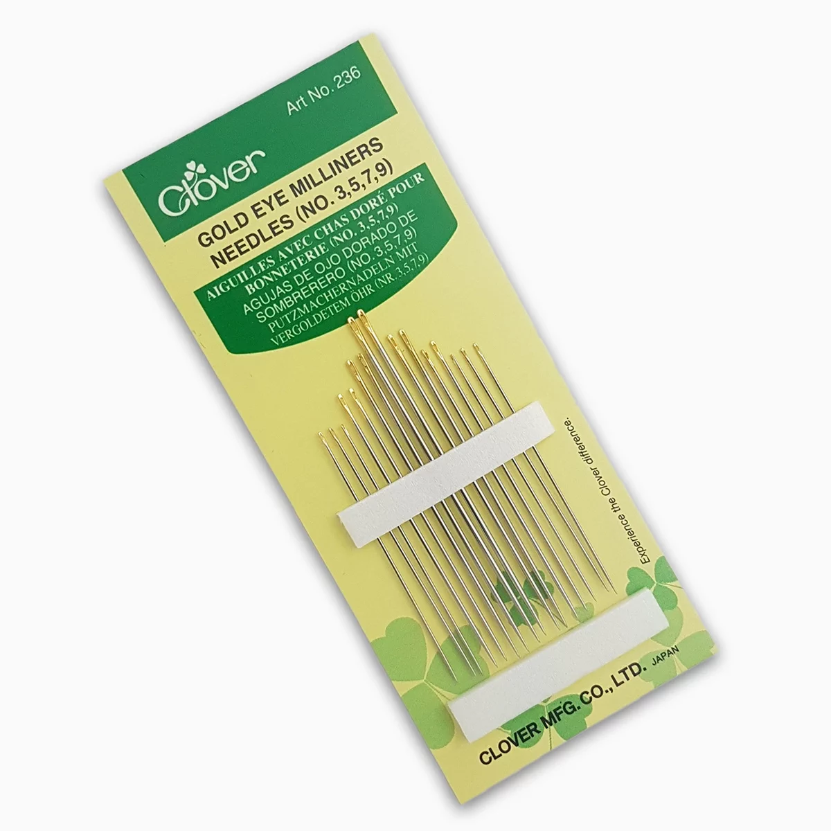 Ушко иглы имеет позолоченное покрытие и уникальную эллиптическую форму, облегчающую продевание нити. Жесткость стали обеспечивается технологиями закалки и отпуска, что придает игле устойчивость к изгибу и излому. Никелевое покрытие для гладкости шитья. Заостренный кончик иглы.