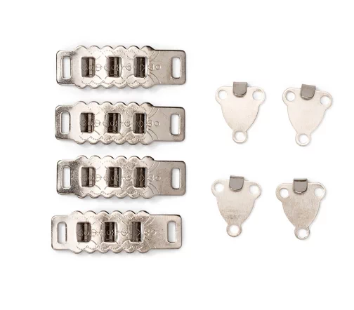Застежки серебристого цвета выполнены из нержавеющей стали и легко пришиваются на юбку или пару брюк. Универсальность применения: можно отрегулировать на три положения в каждом размере. Каждый пакет содержит 4 застежки для пояса юбки и брюк шириной 4 мм.