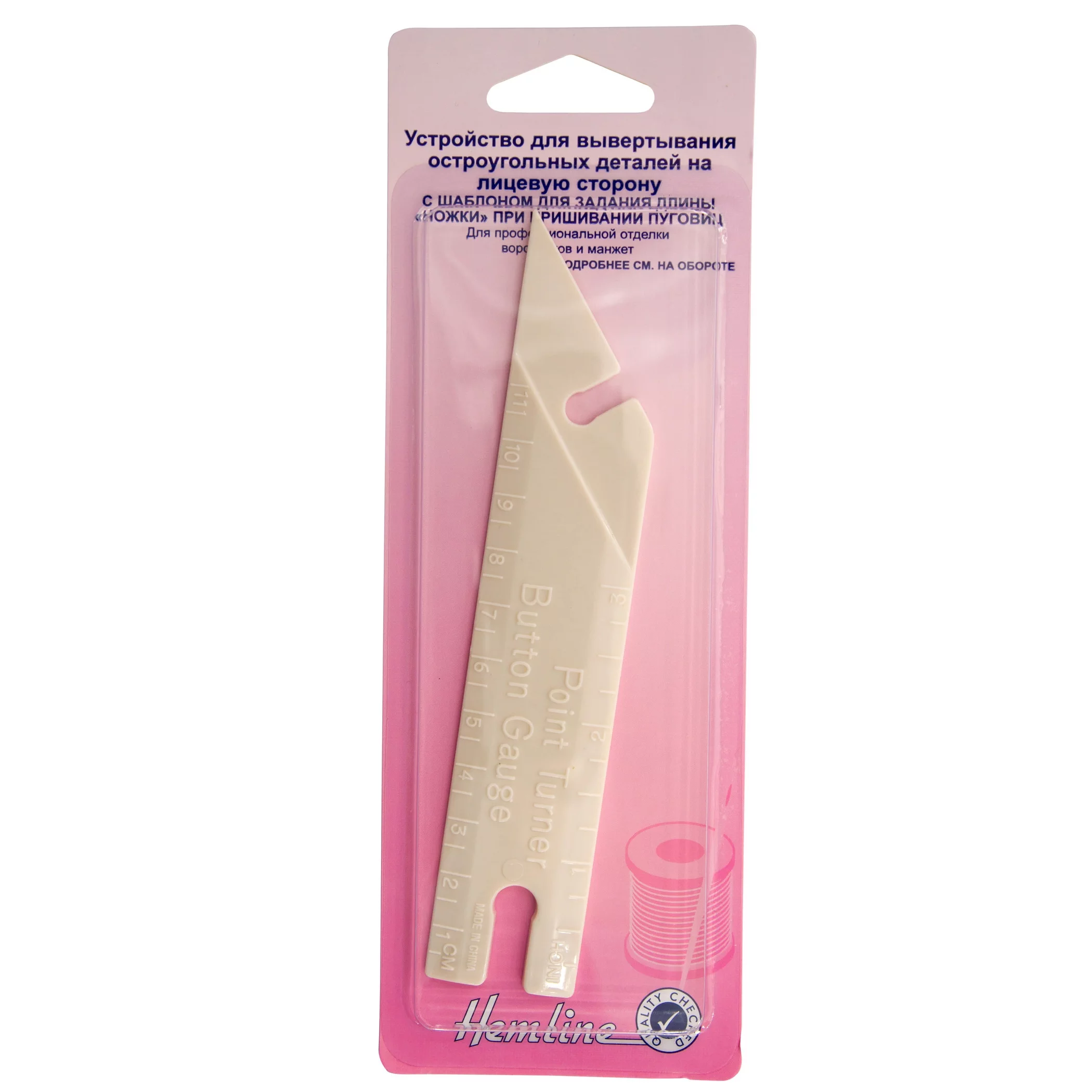 Придает требуемую четкую форму уголкам воротника, карманам, манжетам и другим элементам, используется на стадии отпаривания вытачанной детали после выворачивания. Две выемки разной высоты служат шаблоном, помогающим пришить пуговицу на фиксированную высоту ножки. Применять для пуговиц с отверстиями. Дополнительно на шаблоне есть разметка в сантиметрах и дюймах.
