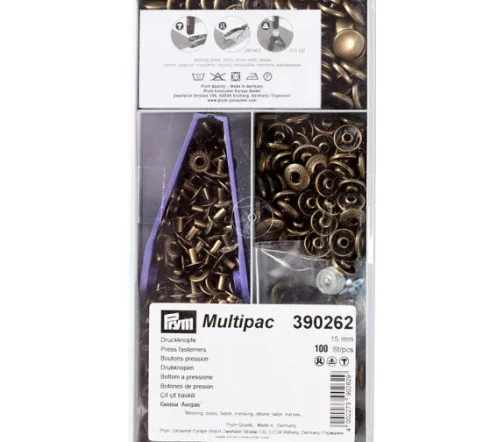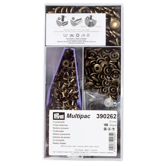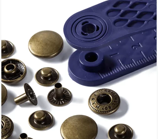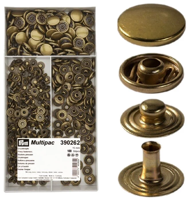 Кнопки Prym ‘Анорак’ заклепочного типа. В комплекте прилагается пластиковый инструмент для установки. Инструкция по установке прилагается на упаковке.