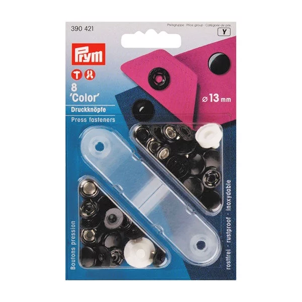 Кнопки металлические Prym COLOR – набор швейной фурнитуры с фиксирующими застёжками. Кнопки имеют специальное тоновое износоупорное покрытие, что позволяет дизайнерам использовать изделия в различных цвето-стилевых сочетаниях. Кнопки Prym отличаются повышенными эксплуатационными характеристиками: прочностью, стойкостью к механическим воздействиям, долговечностью. Кнопки металлические Prym COLOR широко используются при пошиве верхней, детской и джинсовой одежды, брюк, юбок, костюмов, спортивного и туристического снаряжения, сумок и рюкзаков.