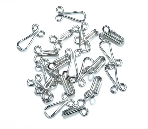 Крючки и петли из нержавеющей латуни с никелированным покрытием, пришивные для легкой одежды. В многоразовом пластиковом контейнере. Потайная плоская застежка широко используется на предметах одежды.