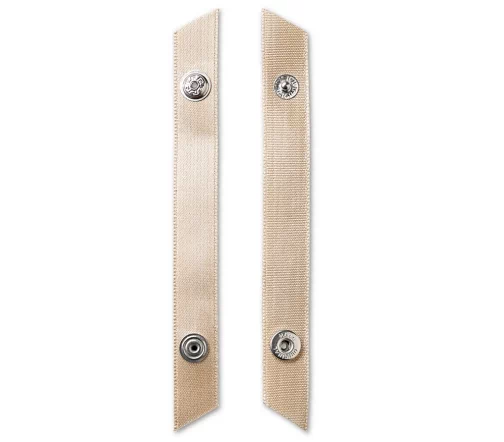 С держателями бретелей под шелк предотвращается выскальзывание бретелей маек и бюстгальтеров при ношении одежды без рукавов. Они вшиваются в области плеч изнутри в одежду. Бретели проводятся через накладку, которая застегивается на кнопку. Таким образом можно прекрасно удерживать в положении также и широкие бретели. Держатели бретелей выполнены из 100% полиэстера и укомплектованы нержавеющей кнопкой из латуни. Они продаются комплектами по 4 штуки на картонной карте или по 1000 штук в большой упаковке белого, черного или телесного цвета. Их можно стирать при температуре до 40 градусов.
