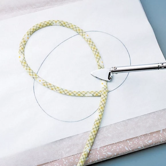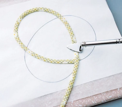 - вставьте отрезанную для косой бейки ткань в нижнее отверстие
