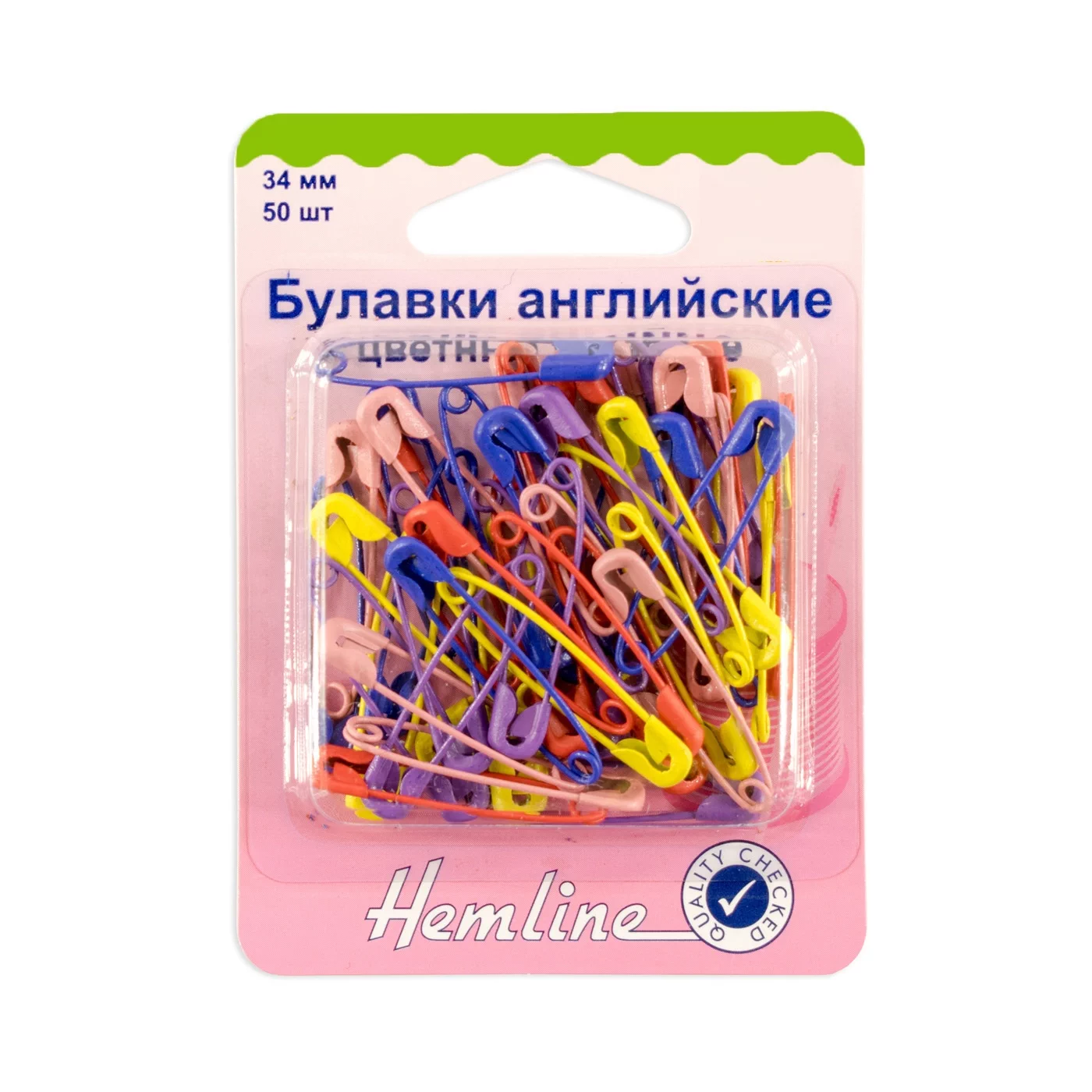 Набор безопасных английских булавок из стали с разноцветным покрытием (красные, голубые, розовые, желтые, фиолетовые). Безопасные булавки широко используются для шитья, раскроя и пэчворка, но также могут использоваться универсально во многих повседневных ситуациях. Тонкие концы булавки облегчают вставку и защиту ткани.