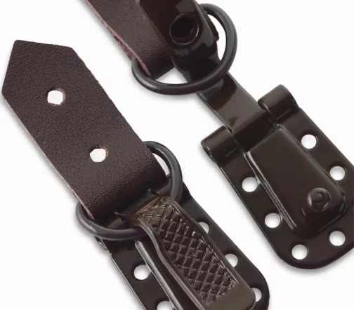 Подходят к большинству изделий из натурального или искусственного меха. Петля закреплена на пришивной ленте из кожи, в которой уже пробиты два отверстия для пришивания. Застежка-зажим привлекательно выглядит и расположена на металлической пластинке с отверстиями для пришивания. Поэтому обе части застежки легко крепятся на одежде и служат надежной и безотказной застежкой.