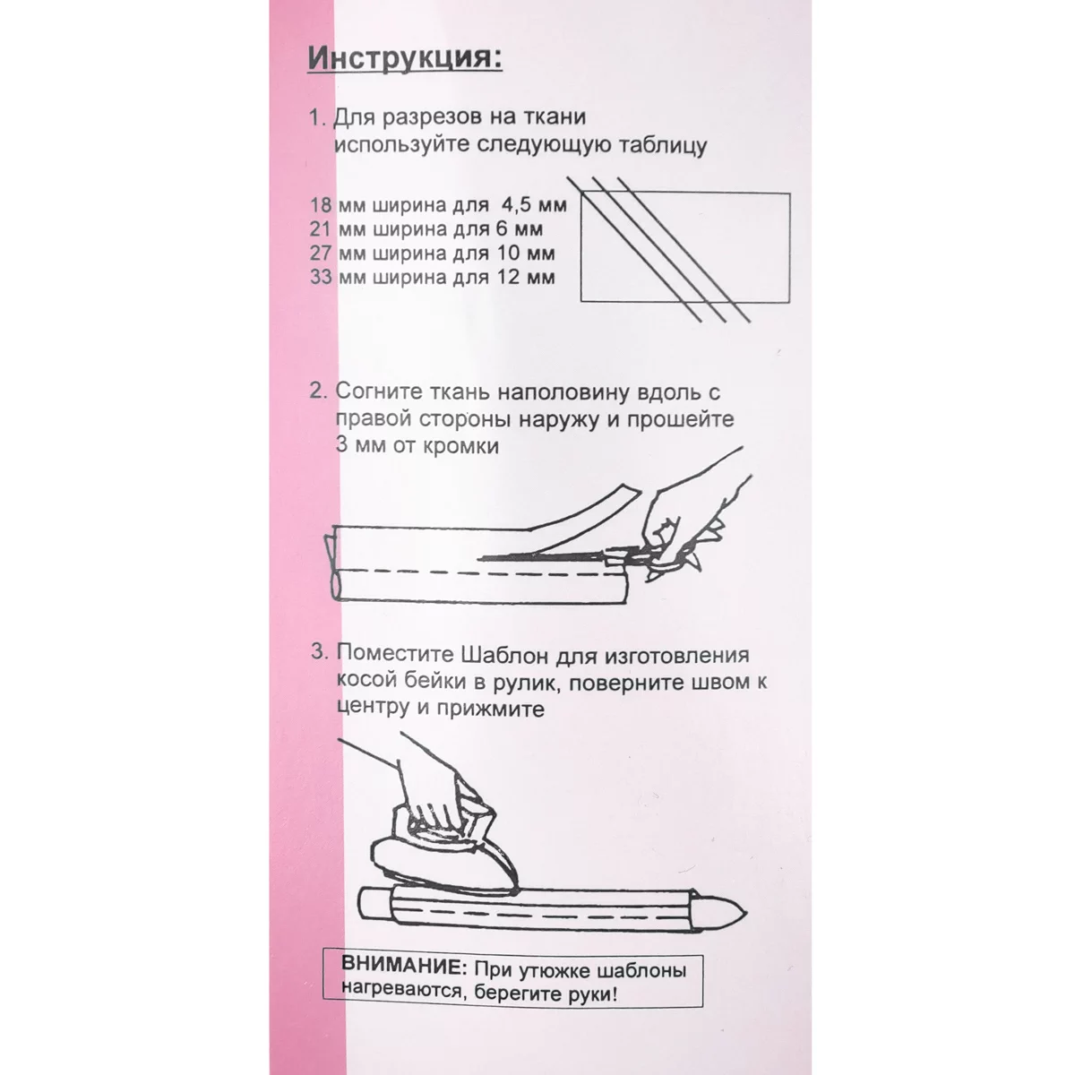 - Закрепить край ткани булавкой и, сдвигая приспособление для косой бейки, обрабатывать сложенную бейку утюгом.