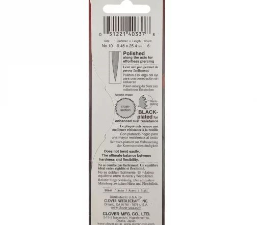 Профессиональные черные иглы CLOVER с особым черным покрытием. Имеют продольную полировку поверхности, что значительно снижает сопротивление трения. Благодаря особому черному покрытию игла легко проникает в ткань и уменьшается сопротивление при шитье. Иглы идеально подходят для стежки.