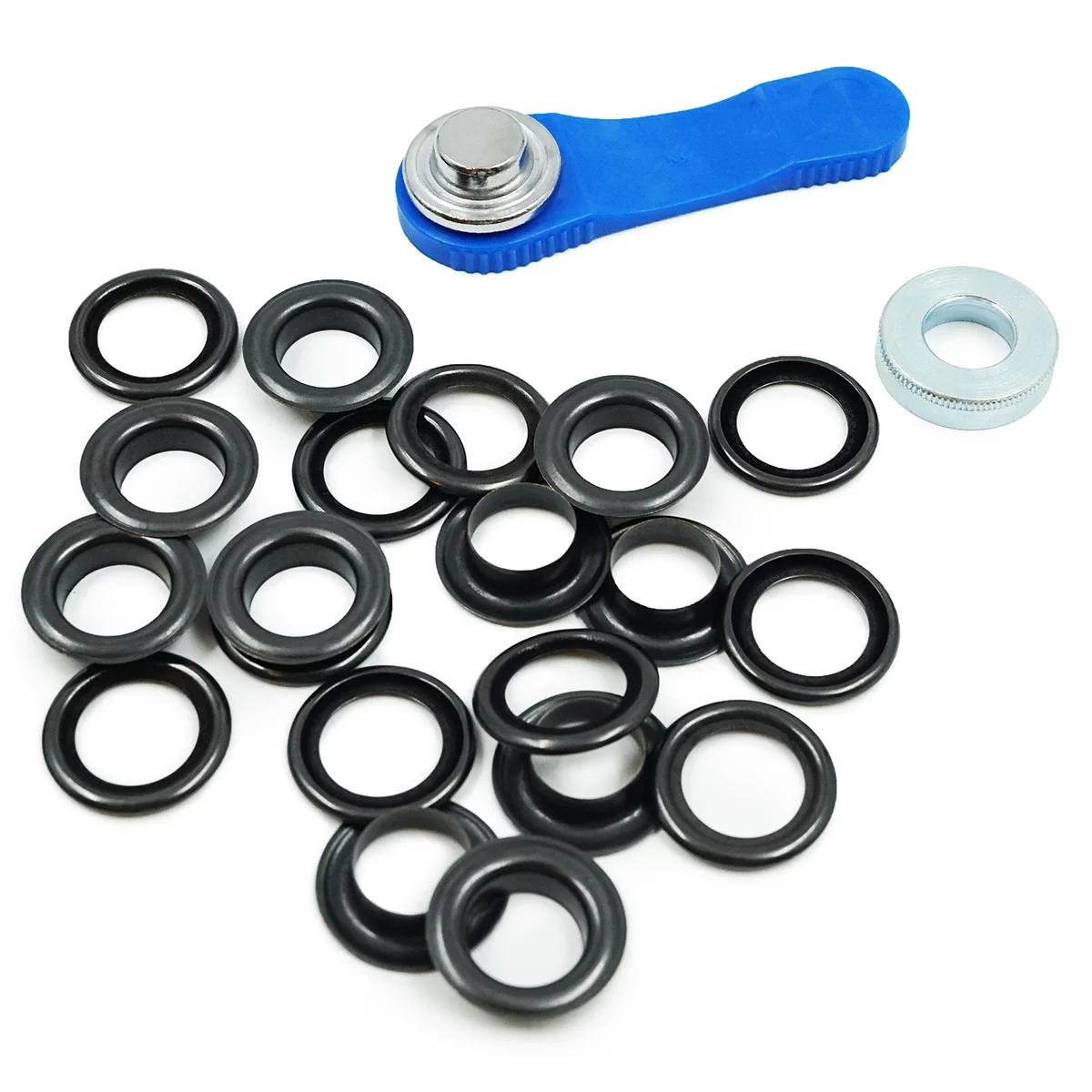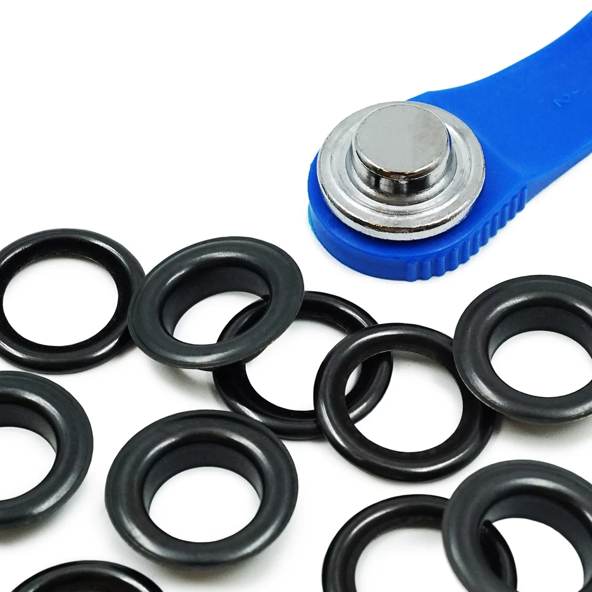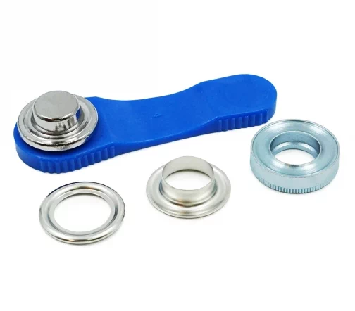 Установка: люверс состоит из шайбы и втулки со шляпкой. Наденьте втулку со шляпкой на лицевую часть изделия, а на изнаночную – кольцо. Затем закрепите люверсы с помощью пластмассового инструмента для установки (входит в комплект).