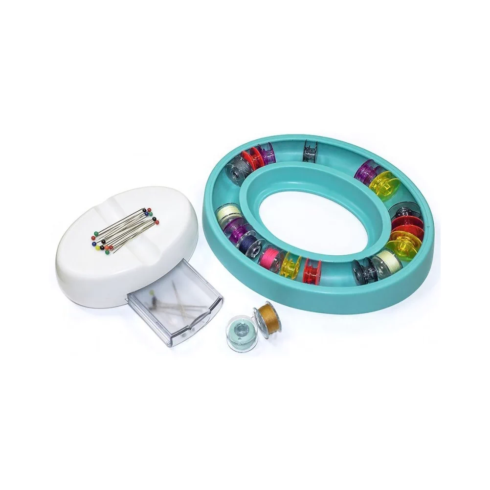 Практичный органайзер для шпулек и булавок из серии Prym Love , состоящий из кольца для хранения шпулек и встроенной магнитной игольницы, - один из лучших продуктов немецкой фирмы! Магнитная игольница примагничивает иглы и булавки в идеальном положении, удерживая их поперек расположенной по центру утопленной ручки, для удобного извлечения. Тяжелый магнит игольницы и его нескользящие силиконовые ножки обеспечивают отличную устойчивость. Снизу в игольнице есть небольшой съемный контейнер для хранения игл. Можно с уверенностью сказать, что ваши иглы и булавки всегда будут в творческом порядке! В кольцо из гибкого пластика можно вставить до 30 шпулек так, что с них не будут разматываться нитки, благодаря специальным материалу и размерам. Кольцо надежно держит шпульки даже при его переворачивании. БЕЗ НАПОЛНЕНИЯ!