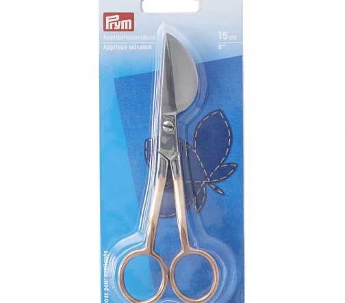 Стальные цельнометаллические ножницы. Благодаря особой форме лезвий, идеально подходят для вырезания аппликаций, обработки краев изделия и квилтинга. Ручки покрыты лаком цвета 'розовое золото'. Ножницы разработаны немецкой компанией Prym, известным мировым лидером в производстве высококачественных принадлежностей для шитья и рукоделия. Характерный изгиб лезвия и угл рукоятки позволяют максимально близко подвести ножницы к контуру и легко срезать лишний материал.