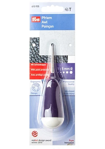Шило с большой эргономичной ручкой позволяет пробить отверстие толщиной 1-5 мм. Острие изготовлено из стали, пластиковая ручка. Имеет защитный колпачок, который можно надеть на ручку, чтобы увеличить ее длину. Шило предназначено для различных плотных материалов: ткани, кожи, замши и др.