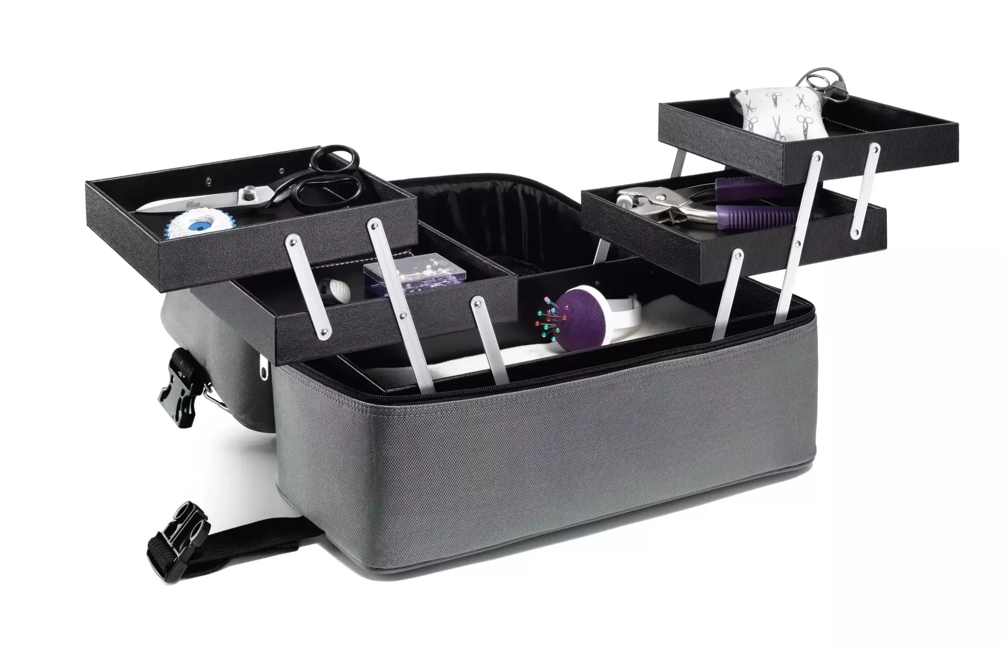 – Внутри находится удобная трехуровневая система хранения, ячейки внутри сумки складываются по принципу 'гармошка'.