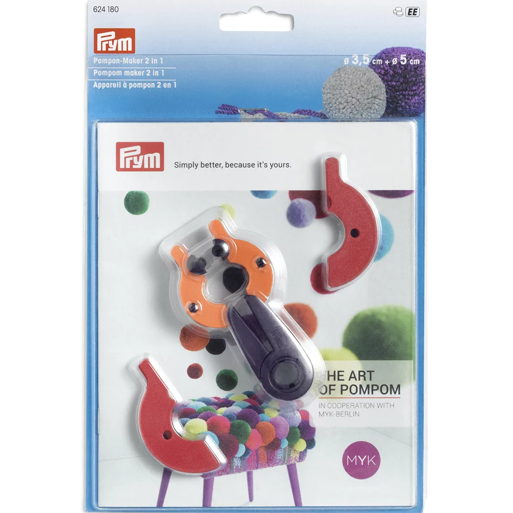 Один инструмент – два варианта: Устройство для изготовления помпонов Prym 2 в 1 также просто, как и гениально, ведь с его помощью можно играючи наколдовать два помпона разных размеров. Два набора дисков разного размера на инструменте можно удобно заменять. Замок обеспечивает привлекательную плотность помпонов. Благодаря практичным ручкам процесс продвигается легко, и пряжу можно оптимально намотать. Так получаются идеальные, плотные помпоны, которые быстро украшают ключи или сумки. Кроме того, благодаря своему привлекательному дизайну, устройство для изготовления помпонов Prym 2 в 1 становится настоящей приманкой для глаз, к тому же оно выполнено из высококачественной пластмассы. Устройство для изготовления помпонов Prym 2 в 1 выполнено в двух различных вариантах, соответственно для размеров 3,5 и 5 см или 7 и 9 см. Пошаговая инструкция с великолепными дизайнами от MYK Berlin прилагается.
