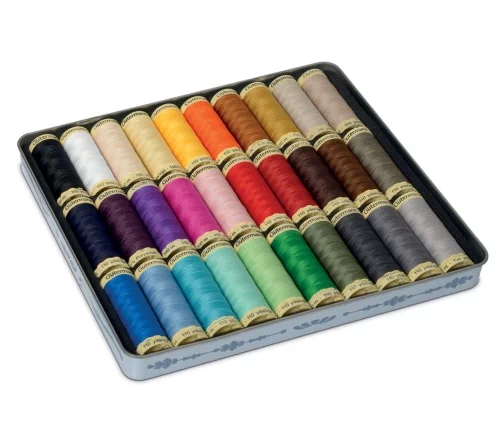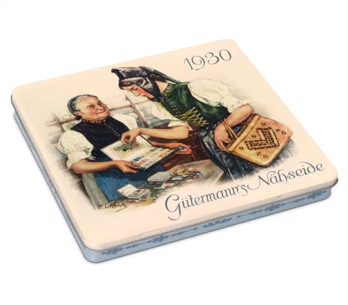 Металлическая коробка 'Ностальгия' в ретро-стиле с набором ниток Sew-All от немецкого бренда Gutermann – прекрасный подарок любителям шить, мастерить сумки, головные уборы и аксессуары, вышивать, заниматься рукоделием.