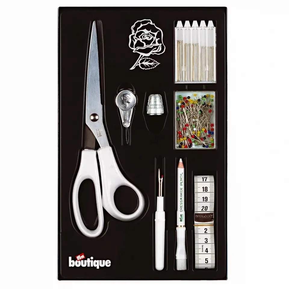 Тем, кто хочет порадовать начинающую швею или любительницу шить, подарочный набор «Роза» из «Prym boutique» окажет неоценимую услугу. Симпатичный подарочный набор состоит из ножниц, наперстка, нитевдевателя, рулетки, устройства для распарывания швов, 10 г булавок со стеклянными головками, 25 швейных игл и мелового карандаша. Швейные принадлежности белого цвета, что создает удачный контраст с черным фоном упаковки. Крышка выполнена прозрачной. Тисненая роза придает дополнительную элегантность. Идеальный швейный набор для подарка!