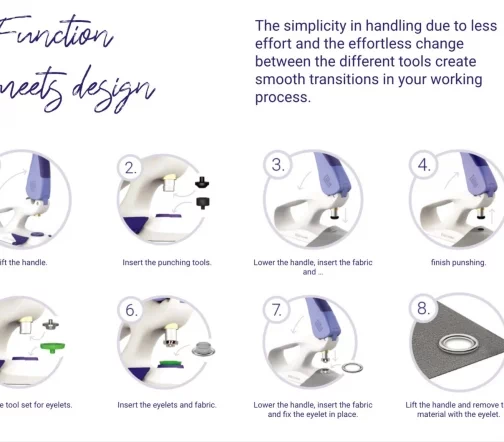 Инструмент Vario Creative идеально подходит для крепления петель с шайбами к коже, джинсам или другим более толстым тканям. Для этого компания Prym предлагает специальный набор инструментов: он содержит 4 пробойника, 4 обжима для люверсов подробные пошаговые инструкции. Для обеспечения успеха каждого проекта инструменты имеют цветовую маркировку и гравировку. Проушины Prym диаметром 11 и 14 мм очень легко обрабатываются. Просто положите высококачественные инструменты из металла и пластика в Vario Creative Tool, и вы готовы сначала пробить отверстие в ткани, а затем украсить его петлями, приобретаемыми отдельно.