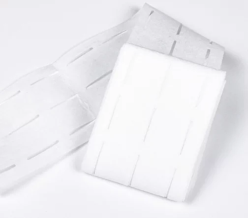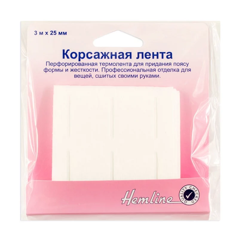 Перфорированная корсажная лента для придания поясу юбок/брюк формы и жесткости. Перфорация определяет направление строчки, что позволяет получить равномерную ширину полосы по всей длине и дает возможность избежать чрезмерного утолщения кромок.