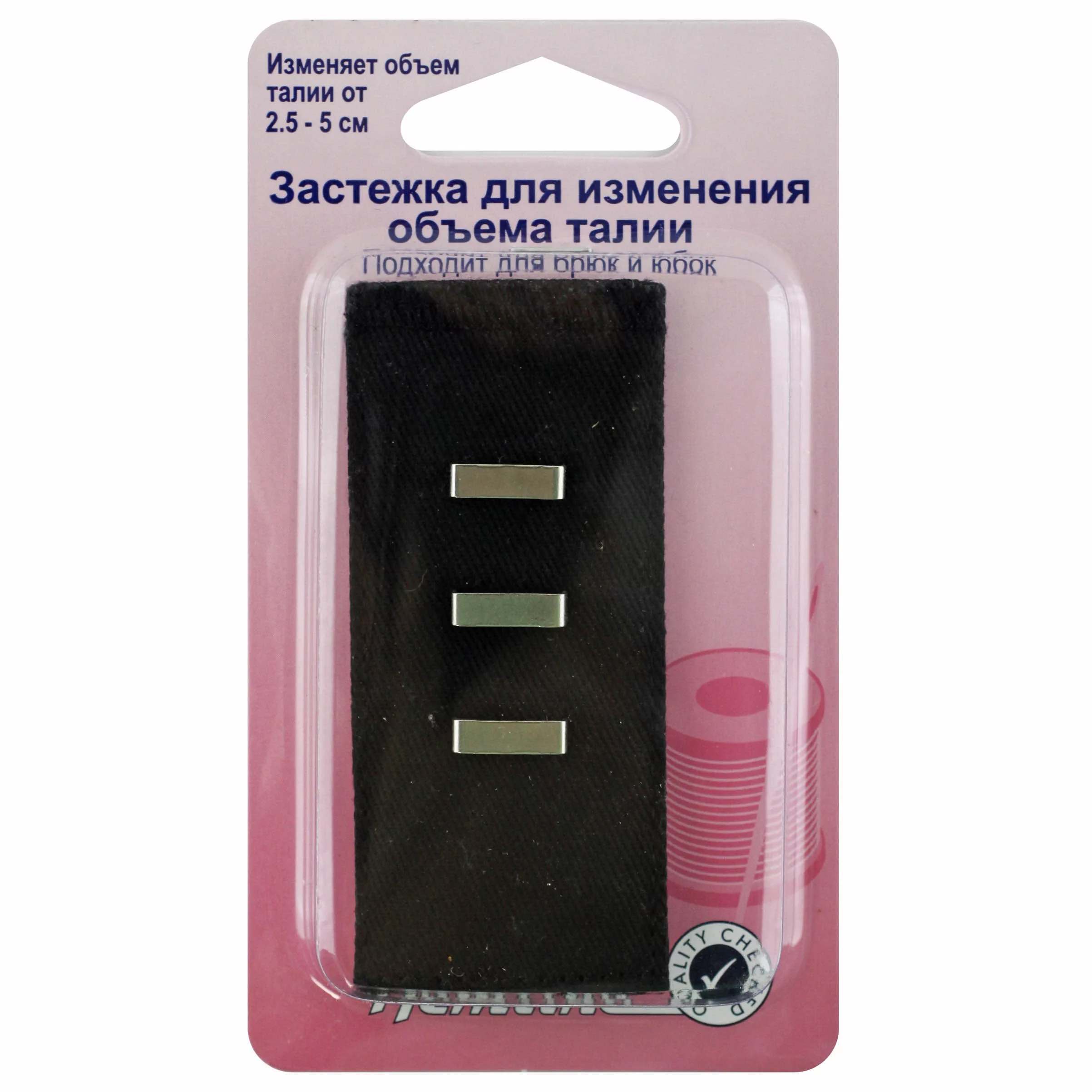 Застежка для изменения объема талии с металлической петлей для крючка подходит для брюк и юбок. Не требует пришивания. Размер застежки 80 х 35 мм. Увеличивает объем талии на 2,5-5 см.