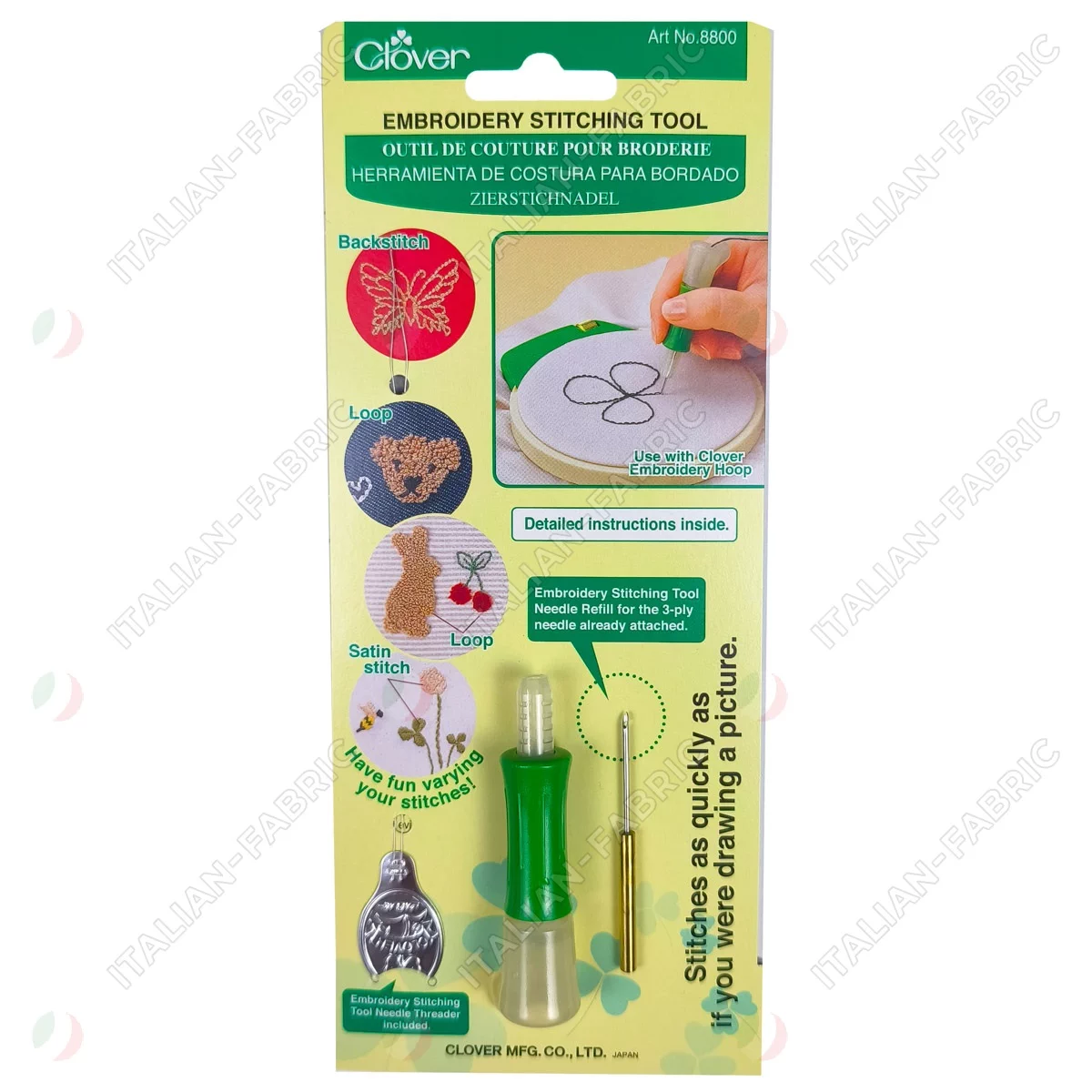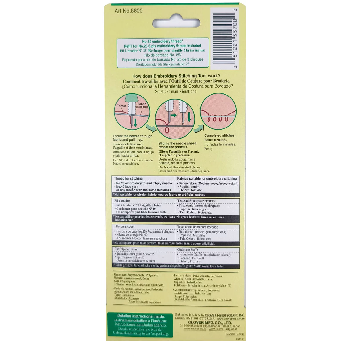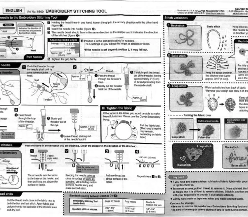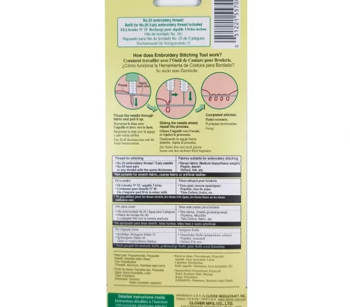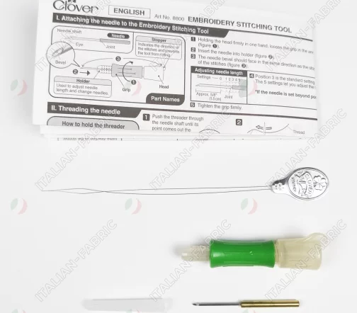 Упаковка включает инструмент для вышивания, одну иглу для трехниточной пряжи и один нитевдеватель.