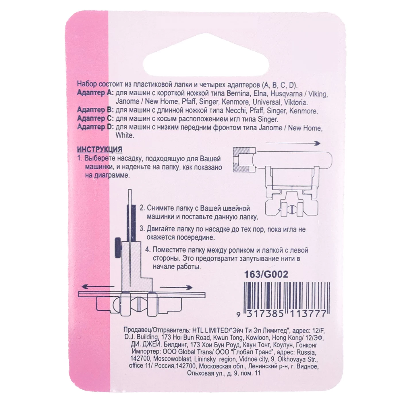 163 Лапка для притачивания потайной молнии с набором адаптеров (5шт.), пластик, Hemline