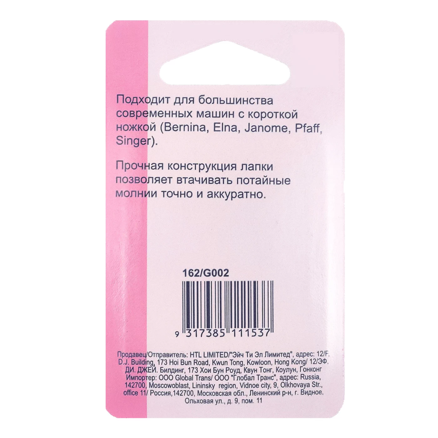162 Лапка для притачивания потайных молний, пластик, Hemline