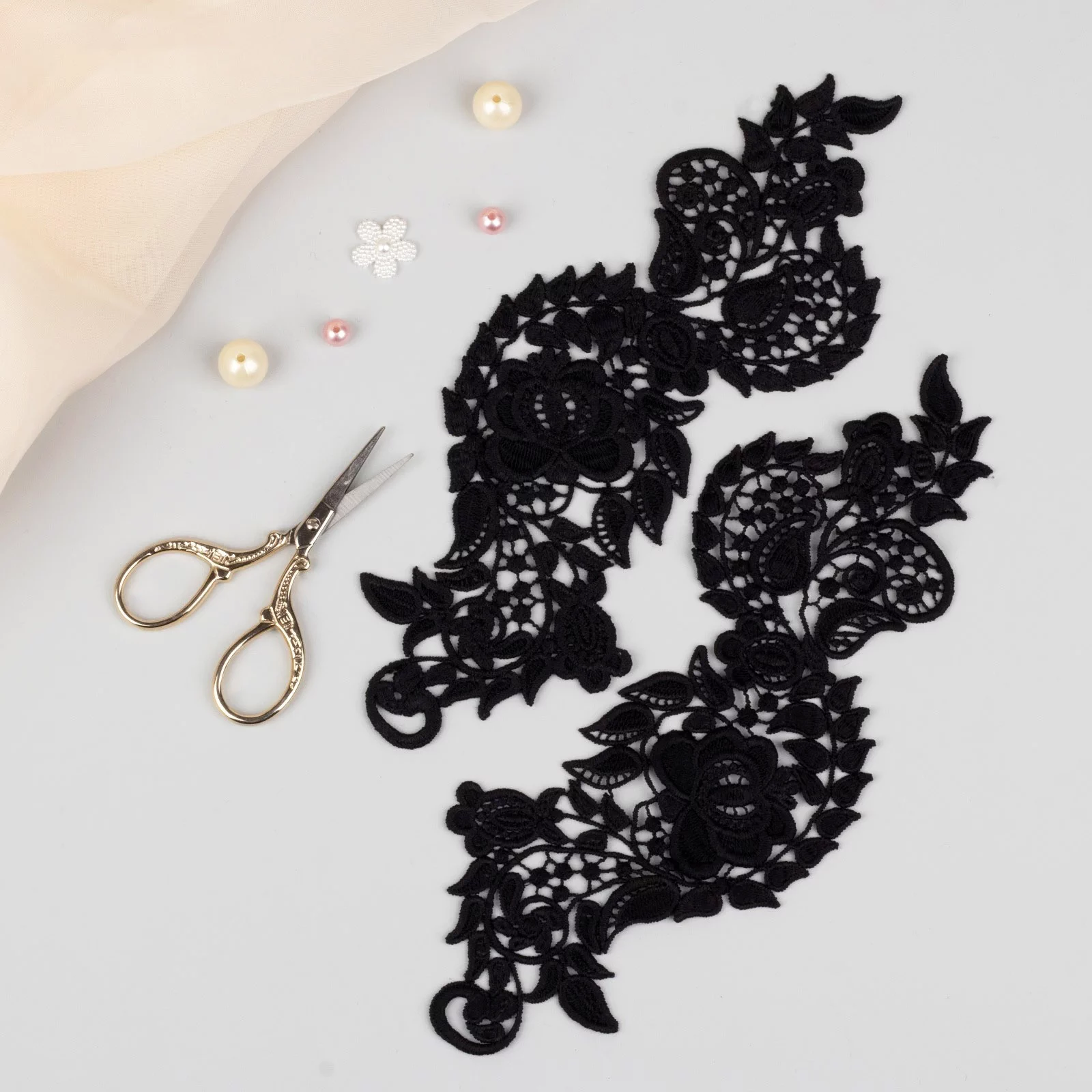 Парные кружевные аппликации, пришиваются к ткани и могут являться прекрасным украшением на одежде. Очень часто кружевной фрагмент используют в праздничных или тематических костюмах, чтобы подчеркнуть идею образа. Пришивной лейс в целом имеет большую область применения в одежде, обуви, сумках, шапках, аксессуарах и других принадлежностях гардероба. Исторически сложилось так, что роль кружевных фрагментов в одежде имеет свой смысл и носит определенный характер. Для рукодельницы лейс- это целый кладезь идей и возможности сделать изделие интересным и образ неповторимый.