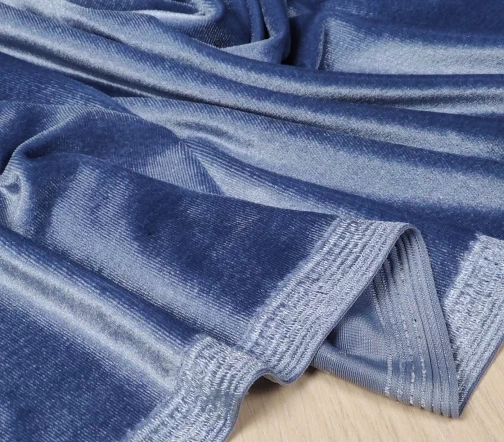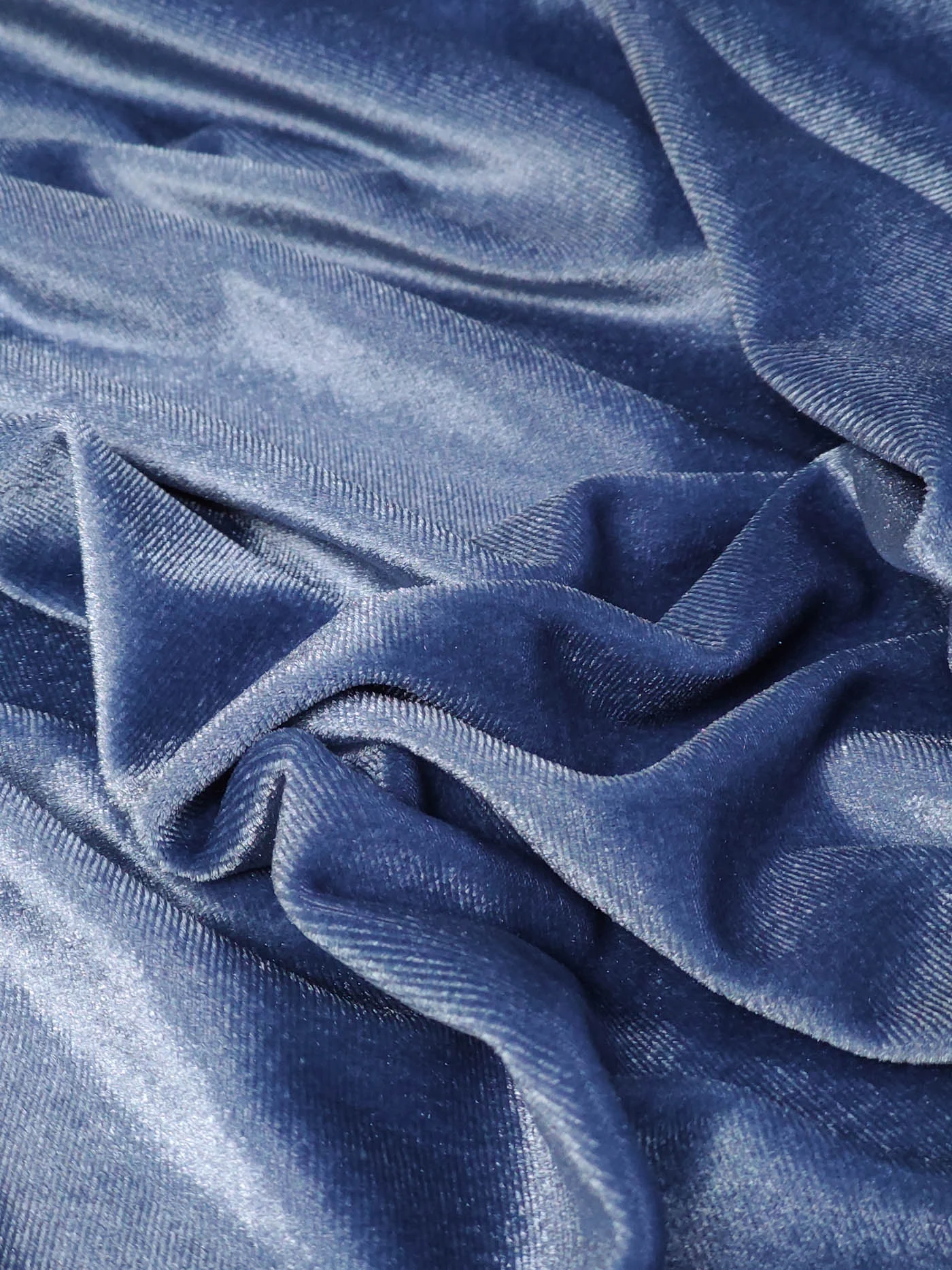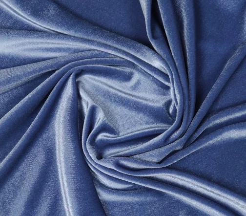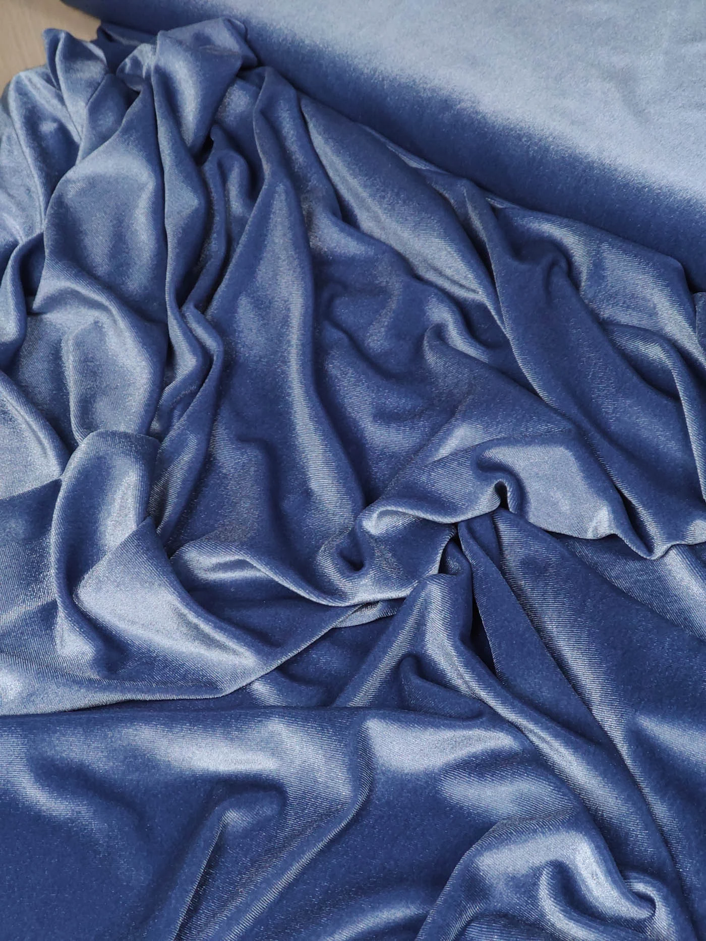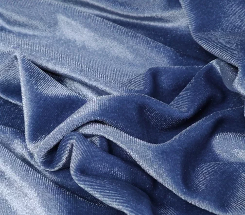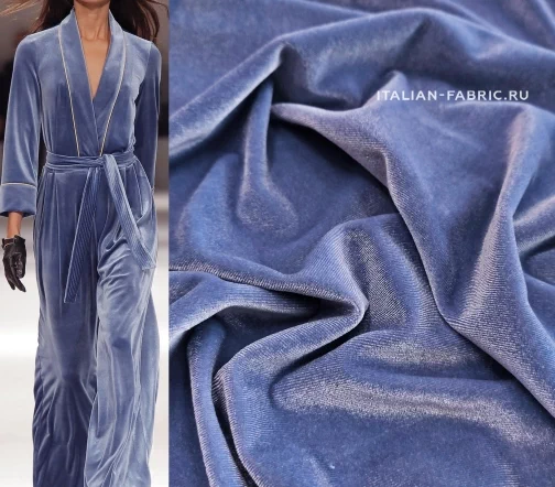 Итальянский бархат-стрейч оттенка джинс, изумительно красиво играющий оттенками на свету. Материал мягкий, приятный тактильно, очень пластичный, средней плотности. Бархат универсален в применении и восхитительно смотрится в комбинезонах, платьях, юбках, брюках, водолазках.