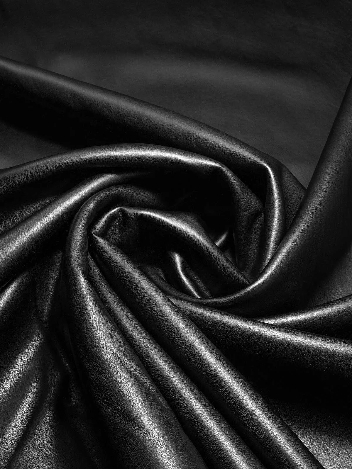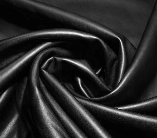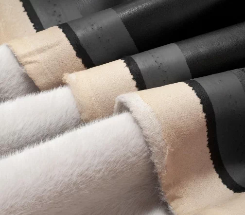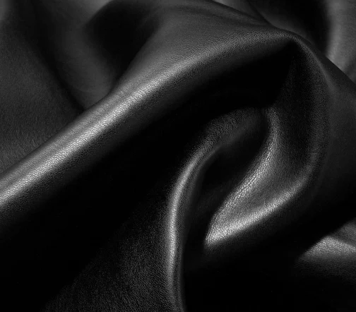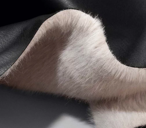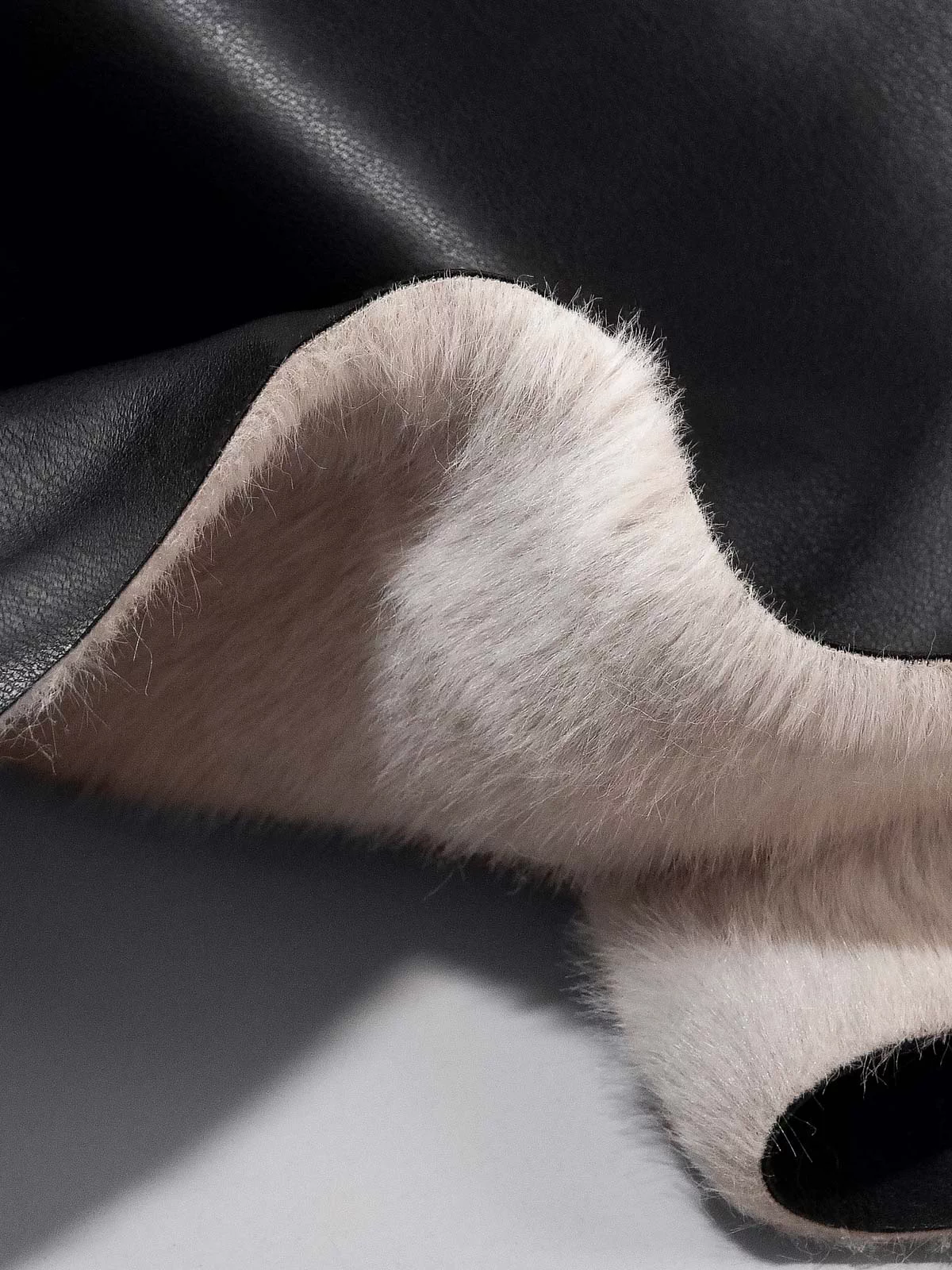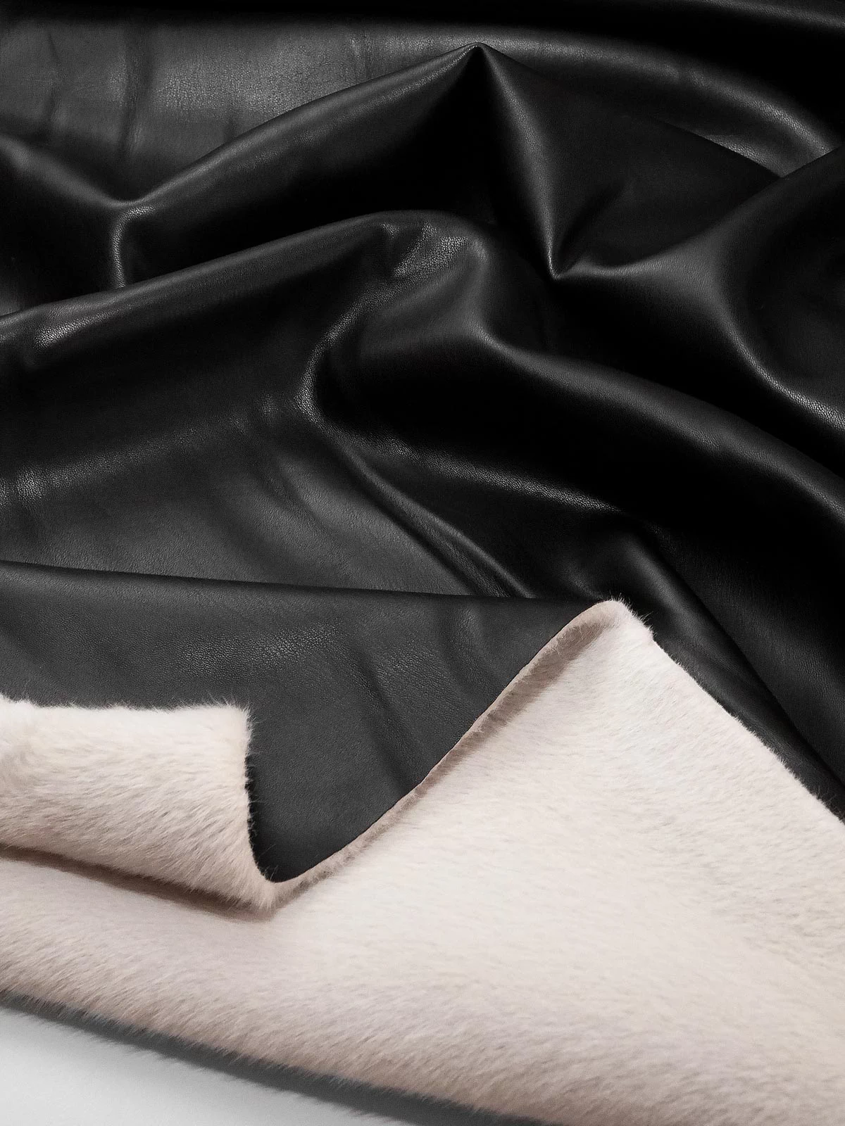Материал представляет собой черную экокожу с одной стороны и искусственный мех светло-бежевого цвета (ворс около 8мм). Подойдёт для total black look куртки-авиатор или для дублёнок любых фасонов.