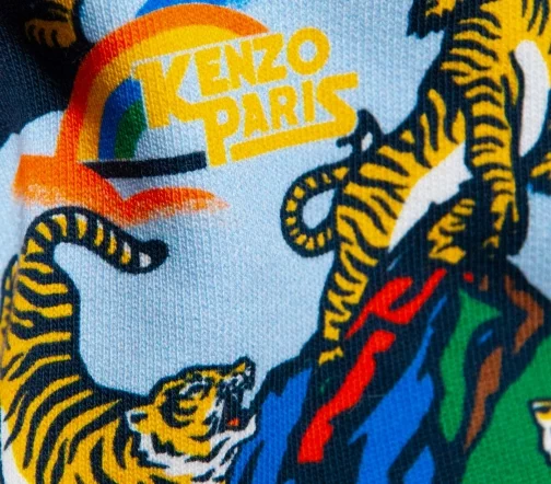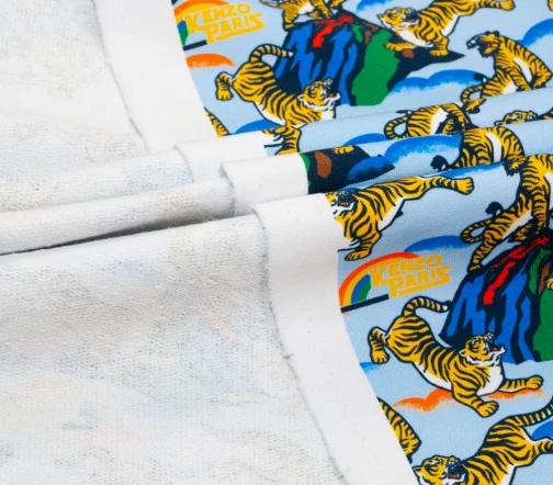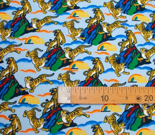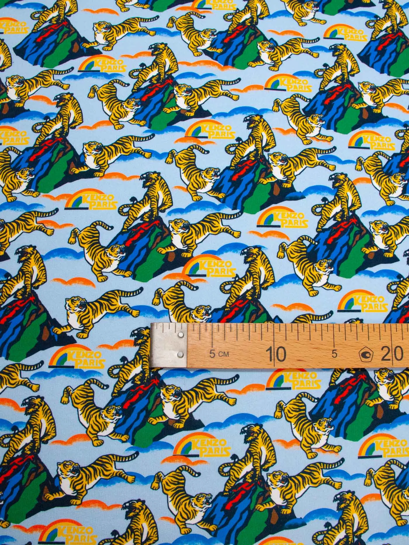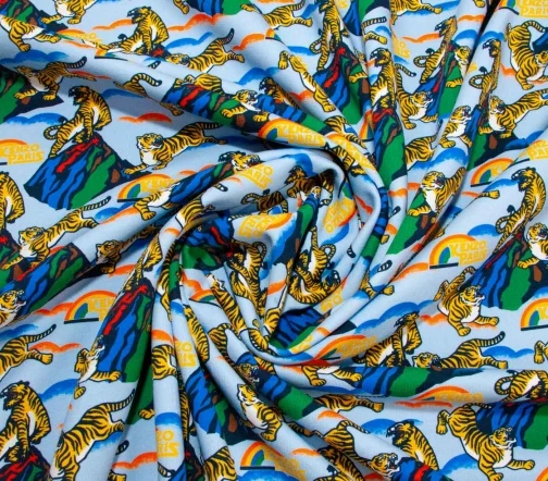 Относительно плотный брендовый подписной футер с тиграми и вершинами гор на небесно-голубом фоне. Сочные цвета и оригинальный дизайнерский принт станут изюминкой вашего нового look'а. Этот эластичный, мягкий, но в меру формоустойчивый материал может превратиться в свитшот, платье или уютный спортивный костюм.