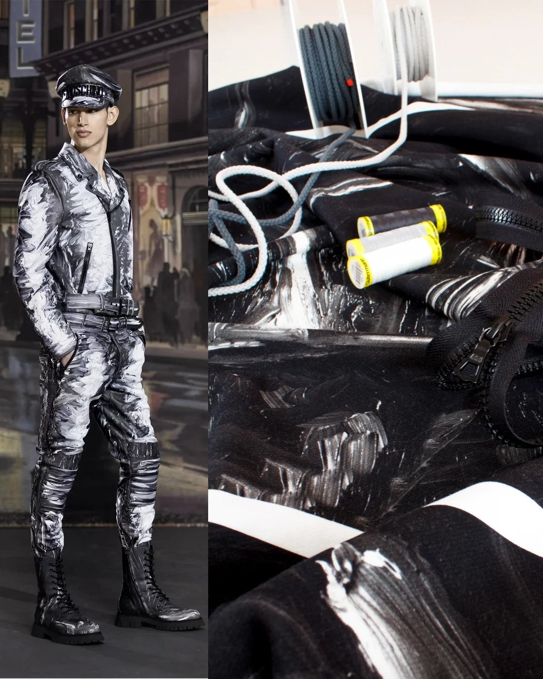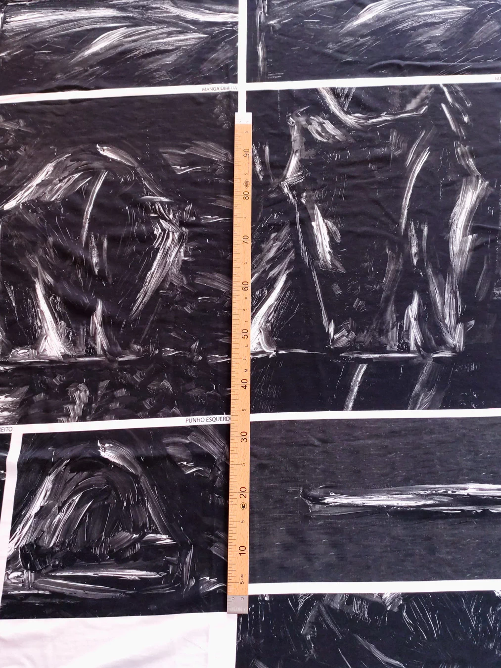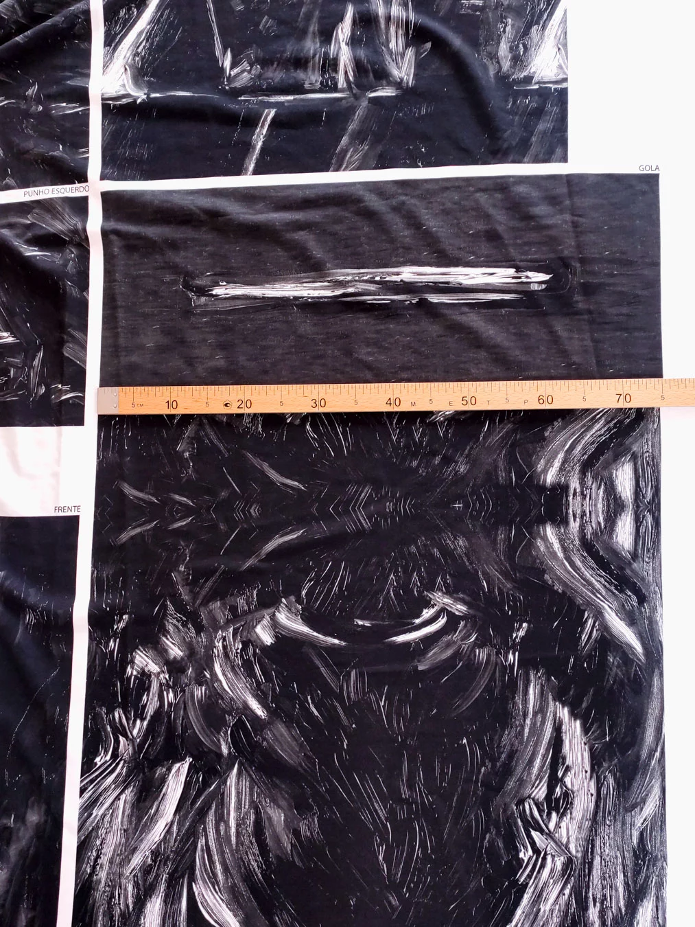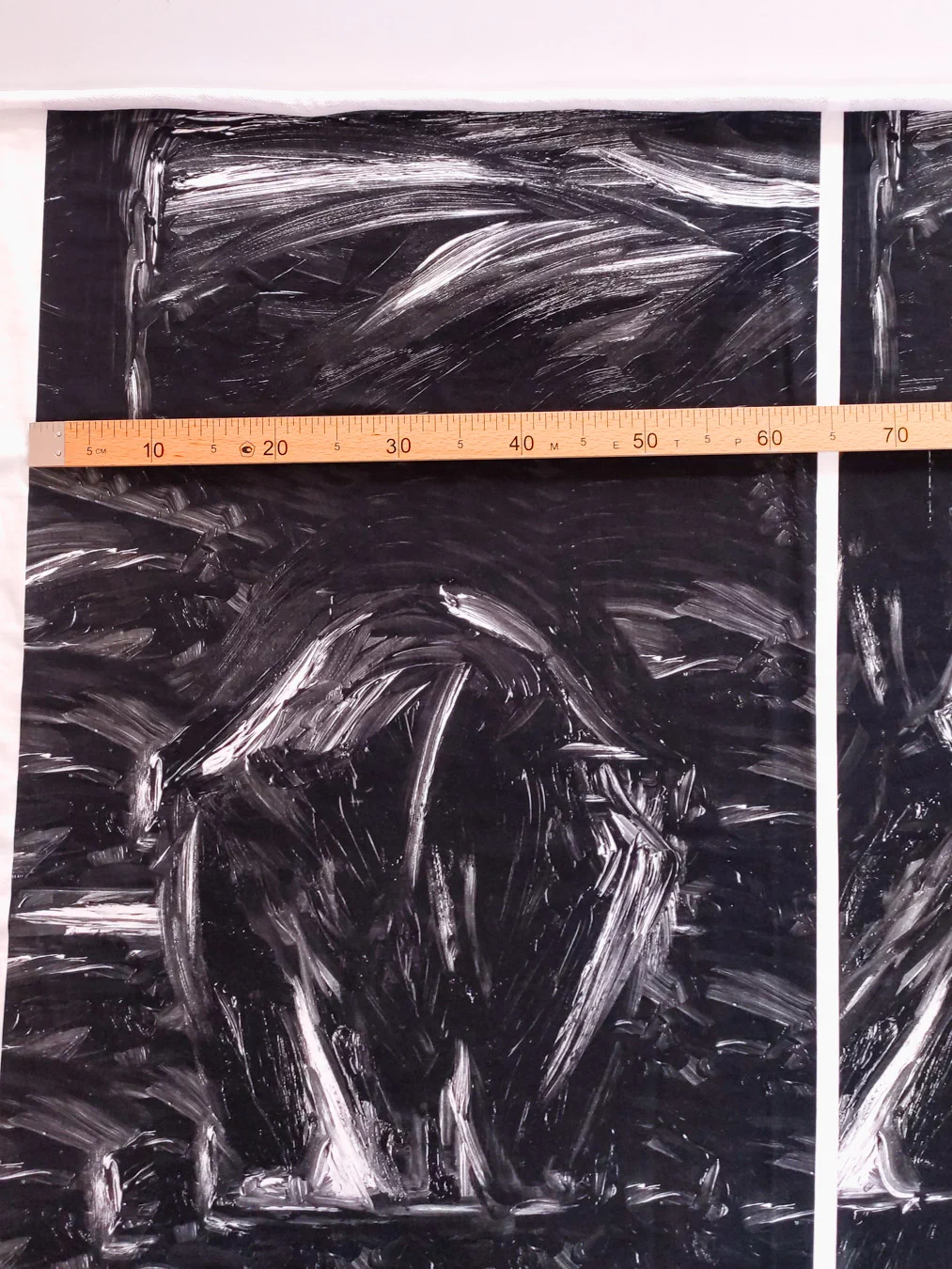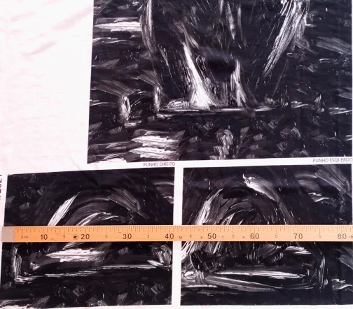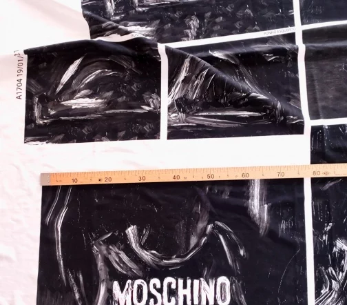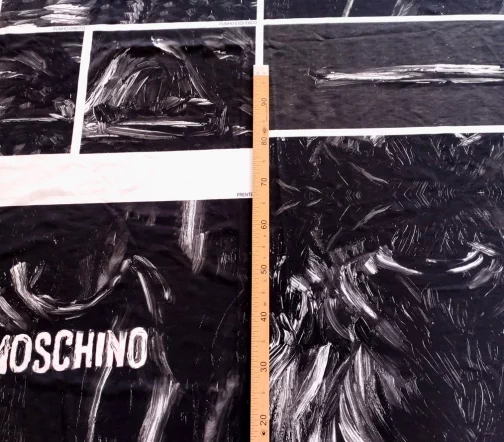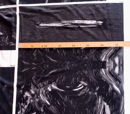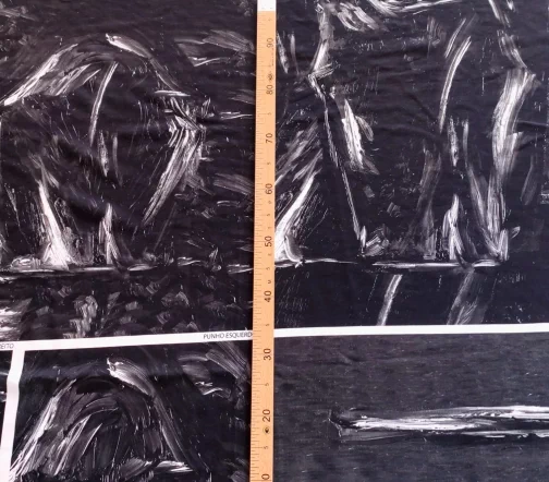 Ткань купонная с необычными мазками по всему полотну. Основа футера очень приятная тактильно, мягкая. Цвет купона в черно-белых тонах.