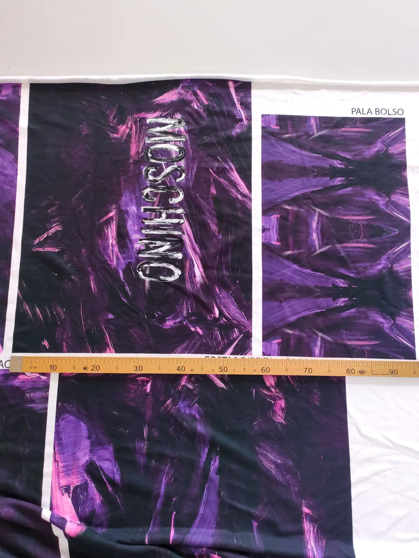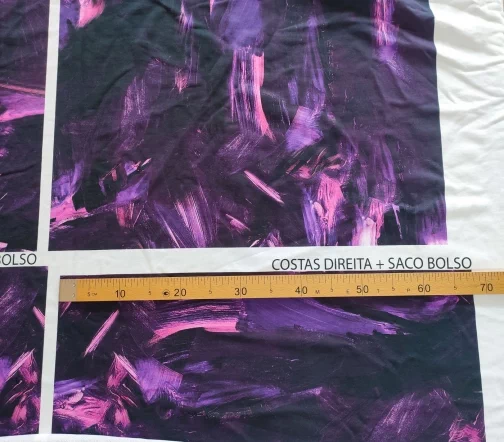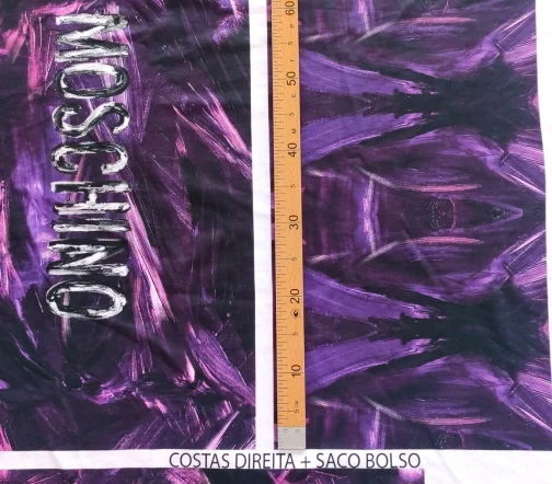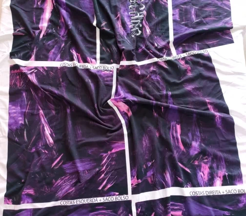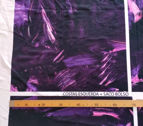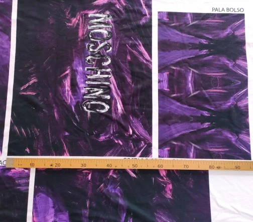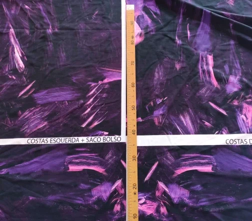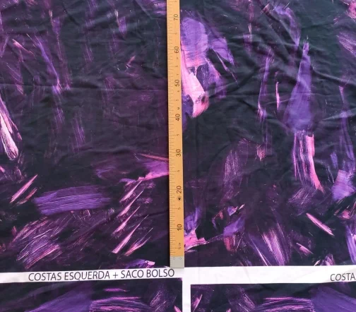 Ткань купонная с необычными мазками по всему полотну. Основа футера очень приятная тактильно, мягкая. Цвет купона в фиолетовых тонах.