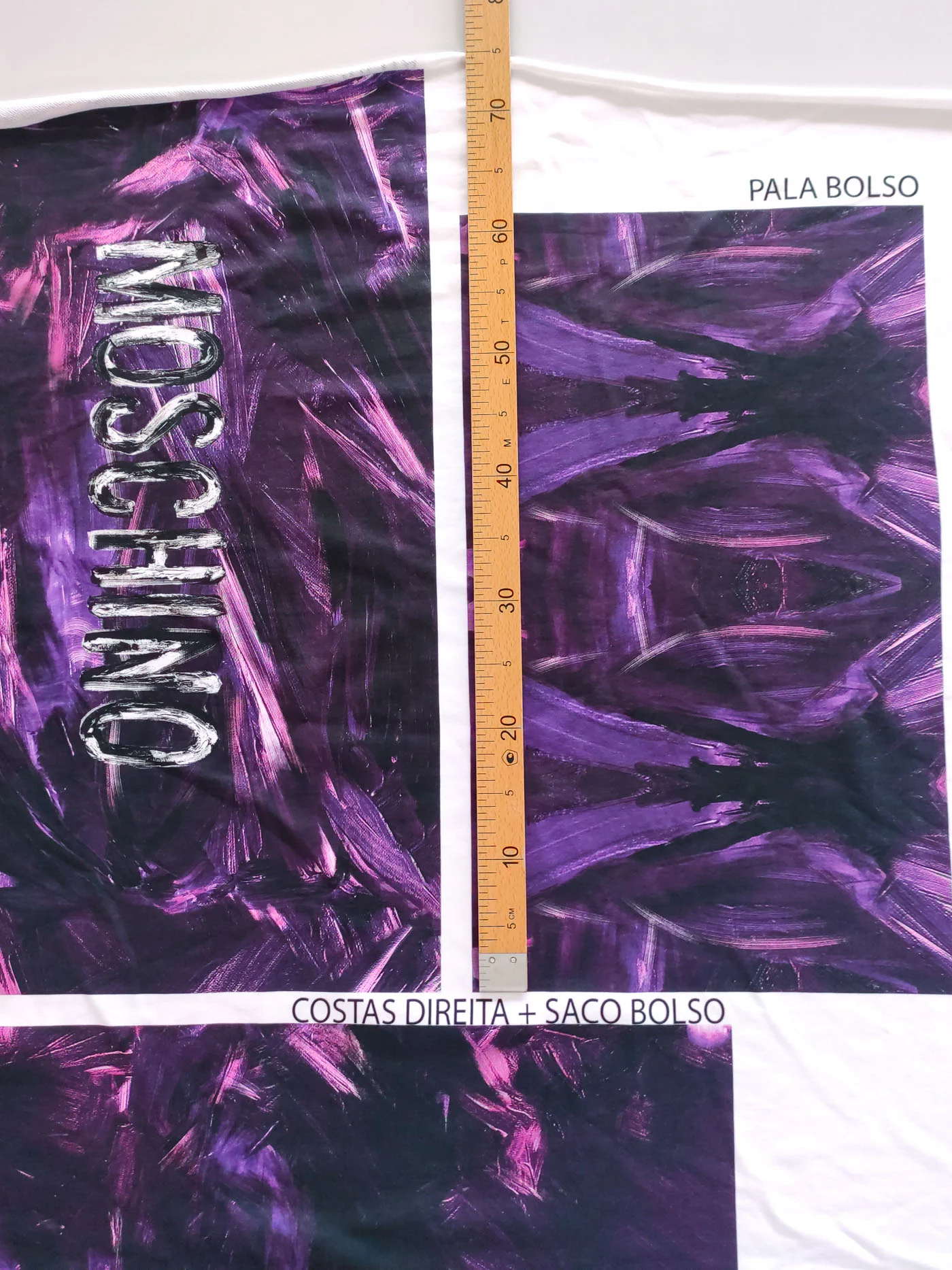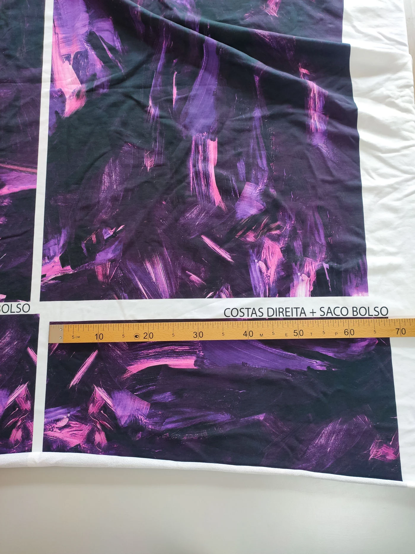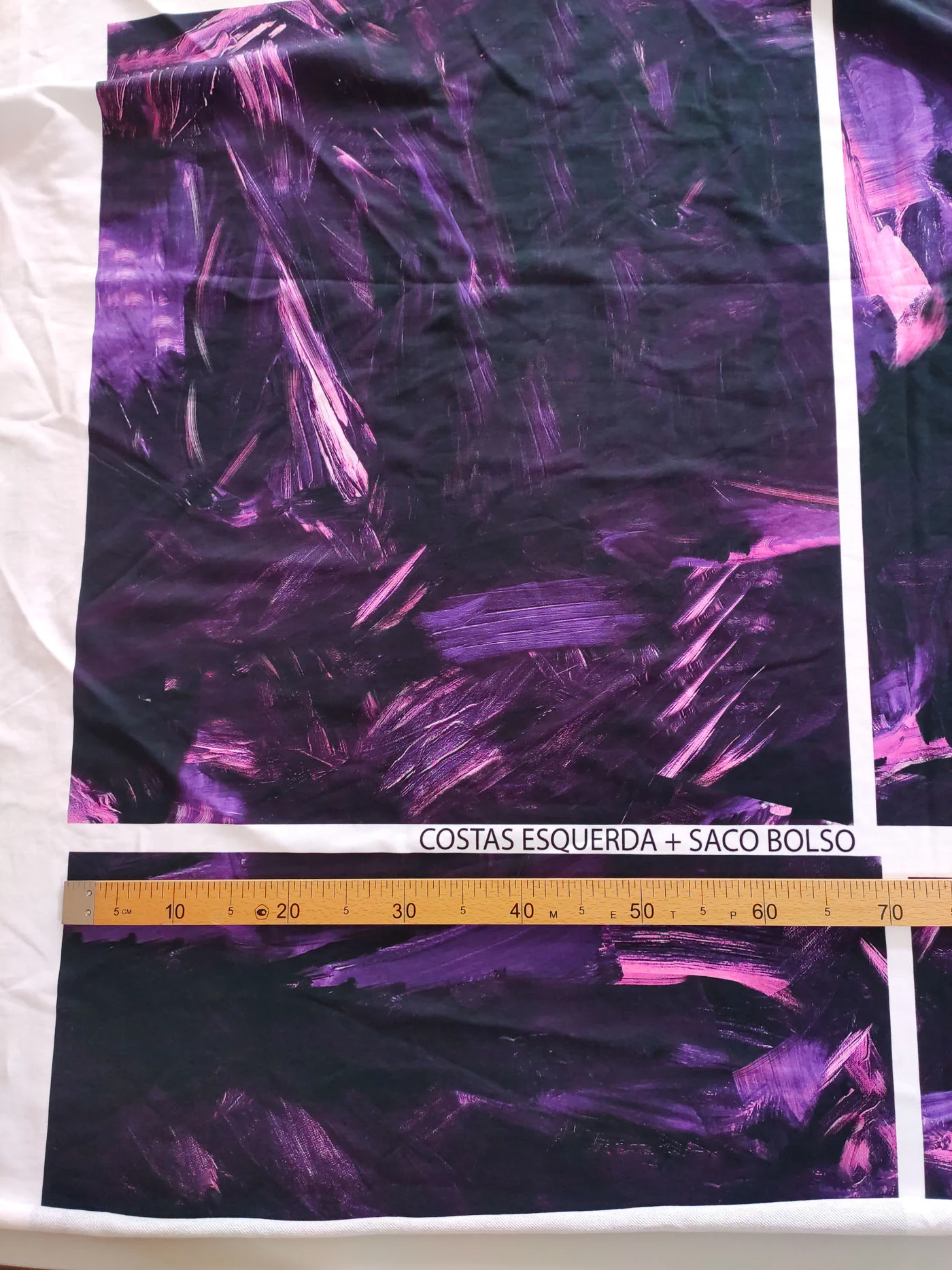 Ткань купонная с необычными мазками по всему полотну. Основа футера очень приятная тактильно, мягкая. Цвет купона в фиолетовых тонах.