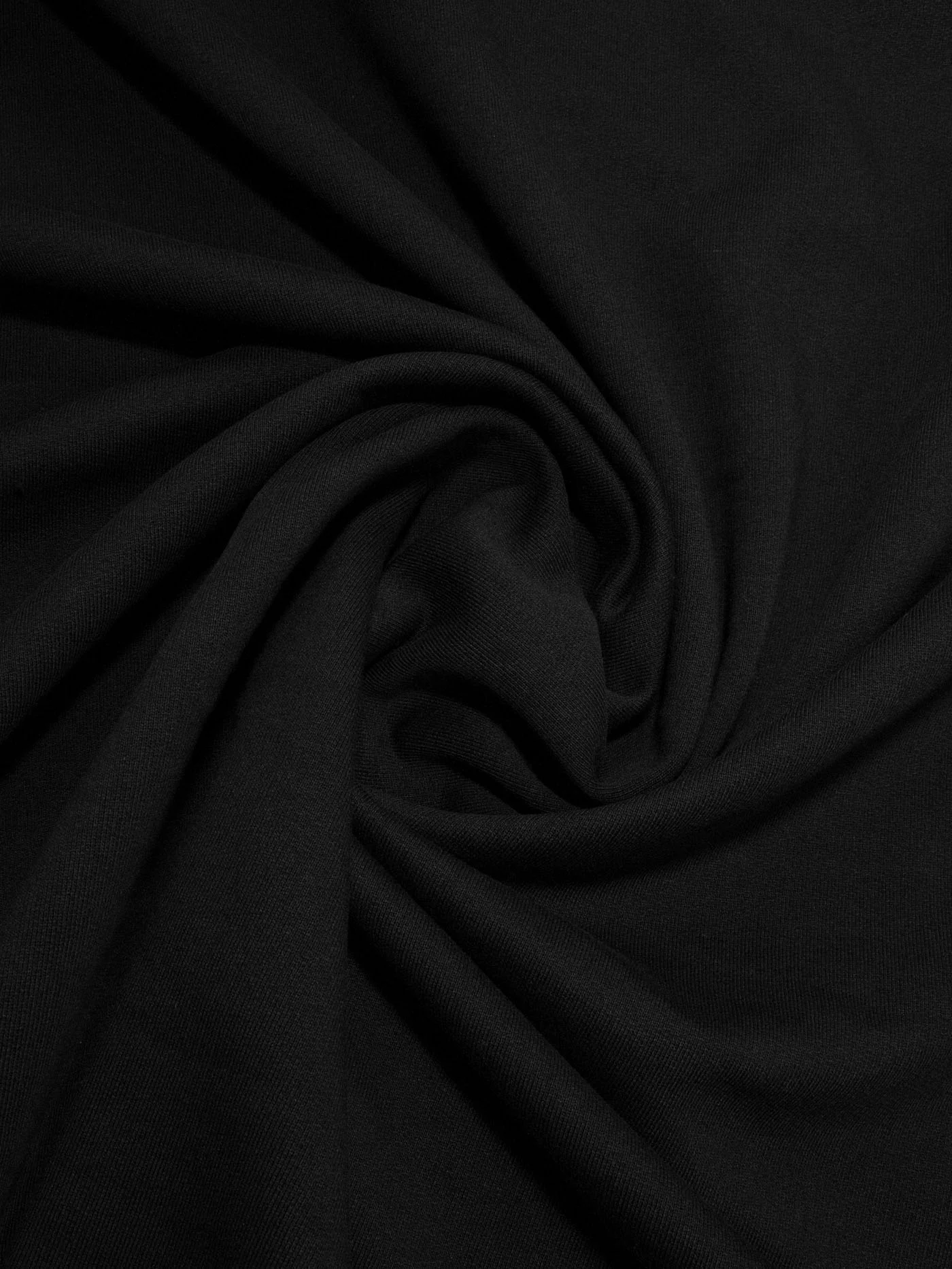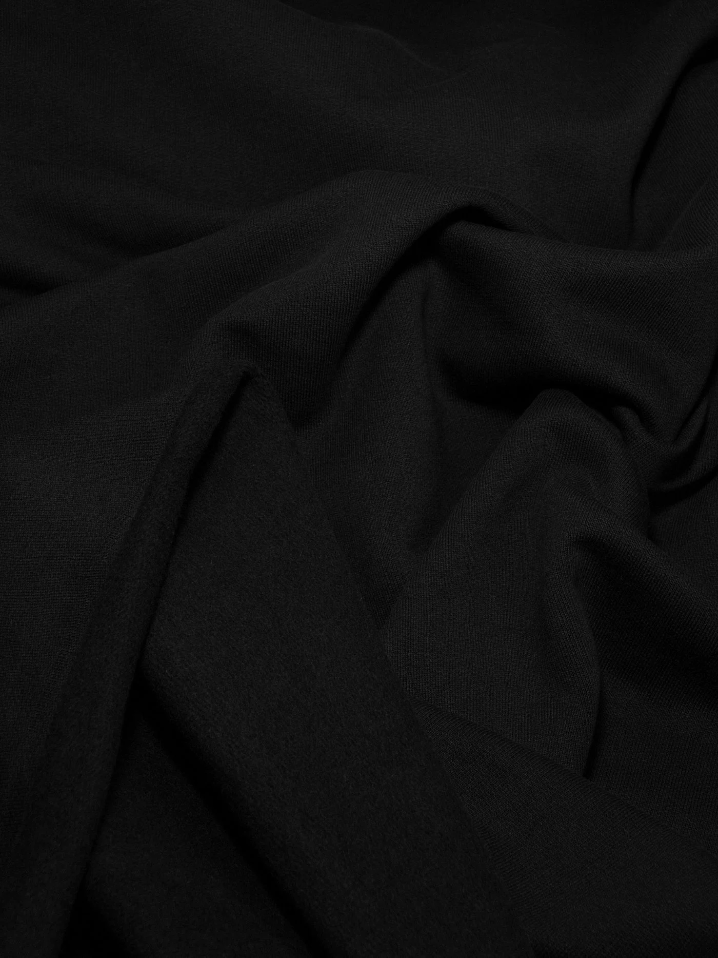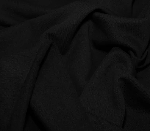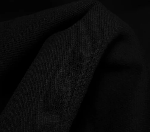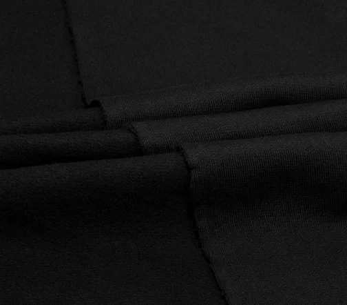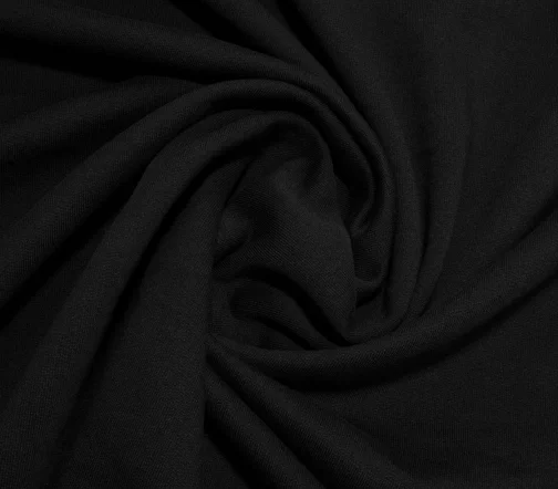 Плотненький футер с флисовым начесом угольно черного цвета, не пилингуется, очень приятный тактильно. Для пошива утепленных худи, свитшота или костюма в стиле спорт-шик.