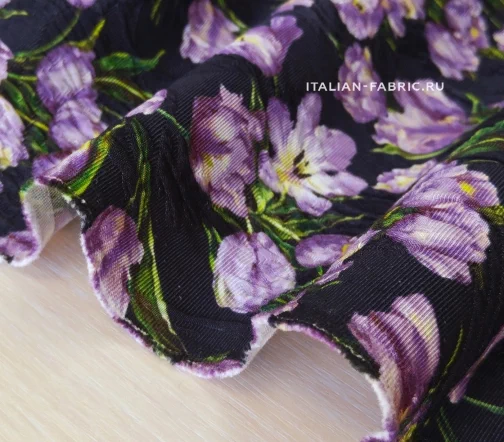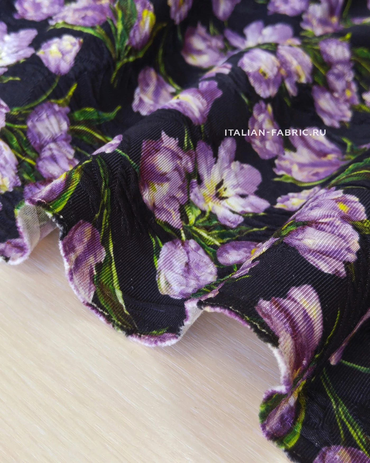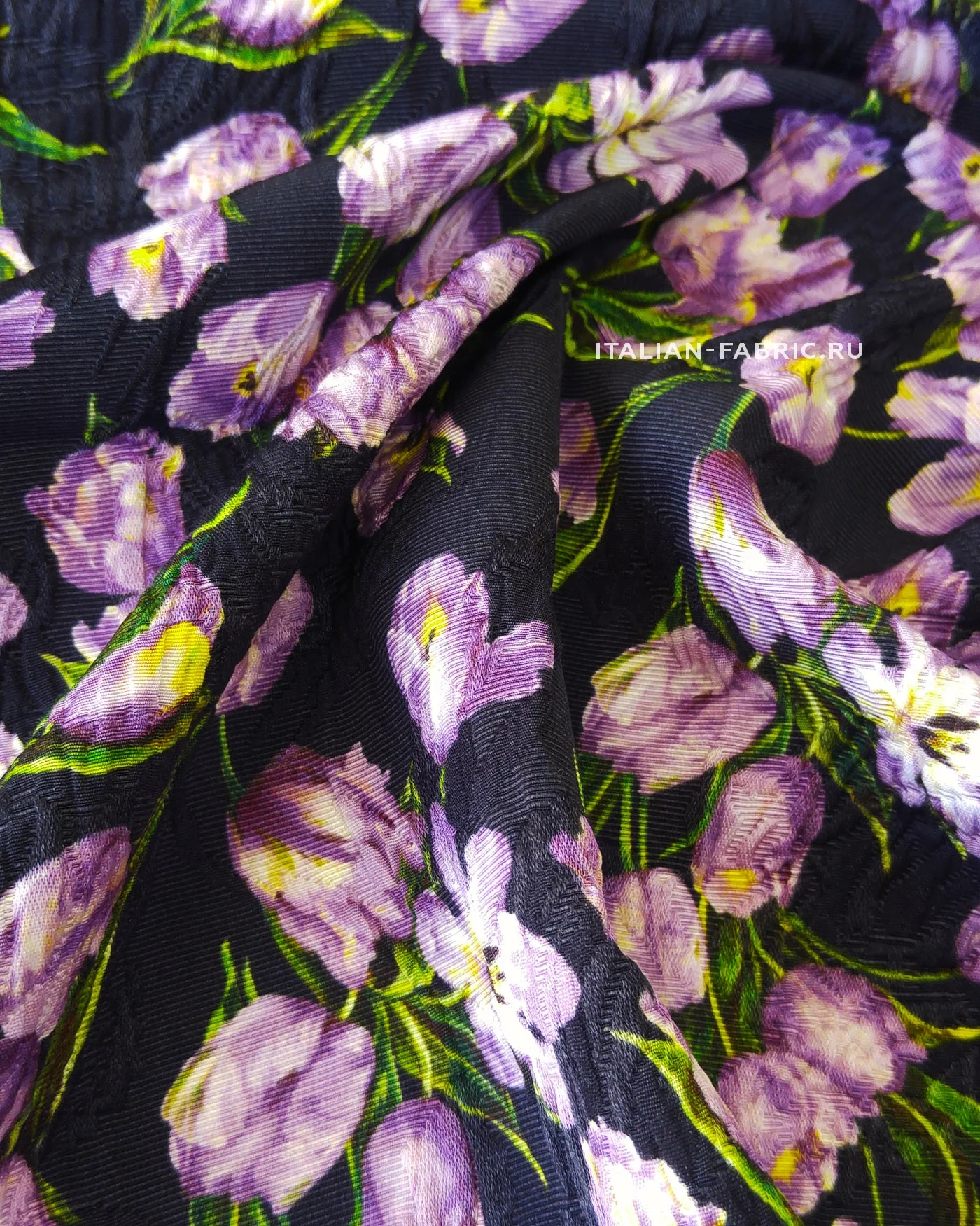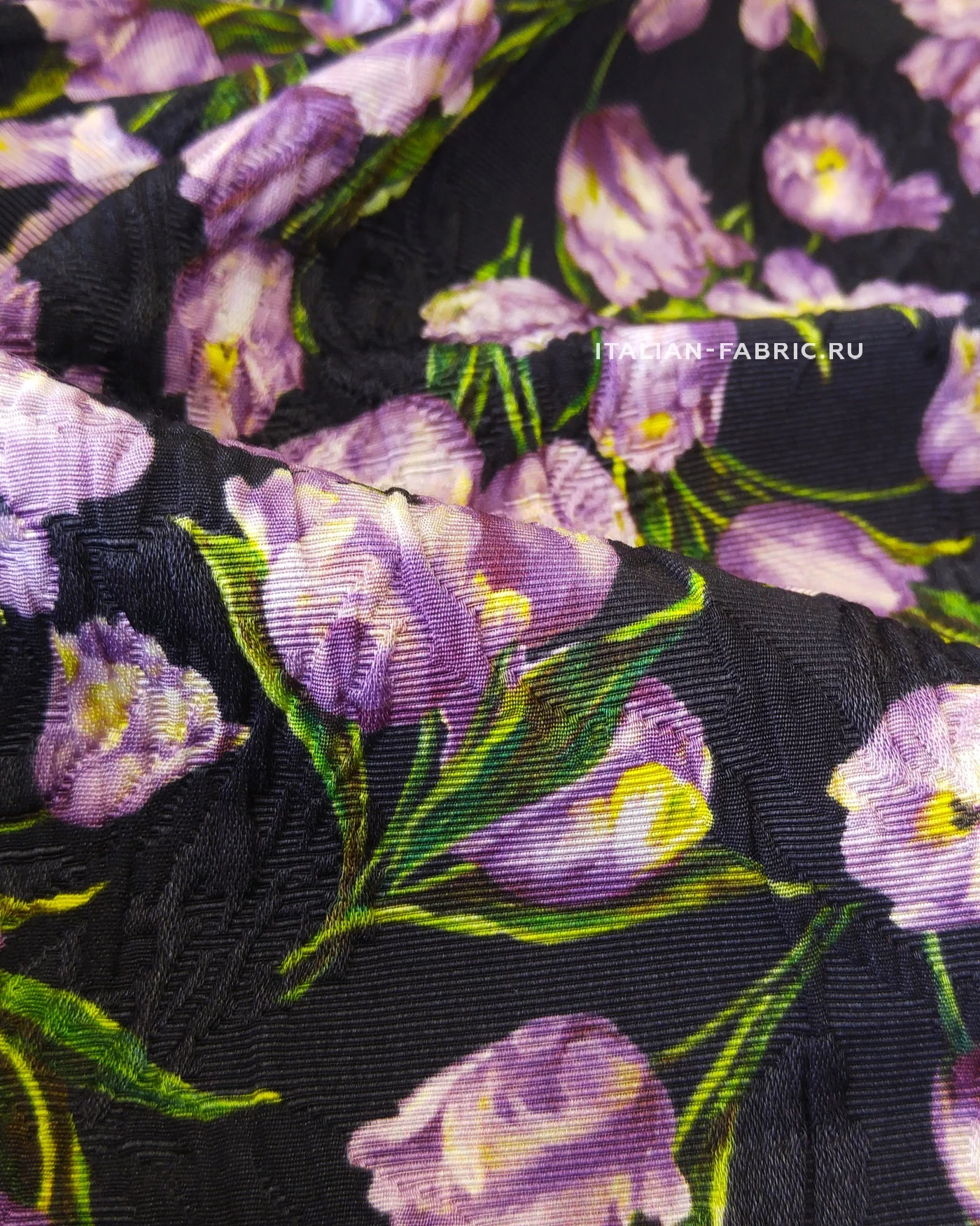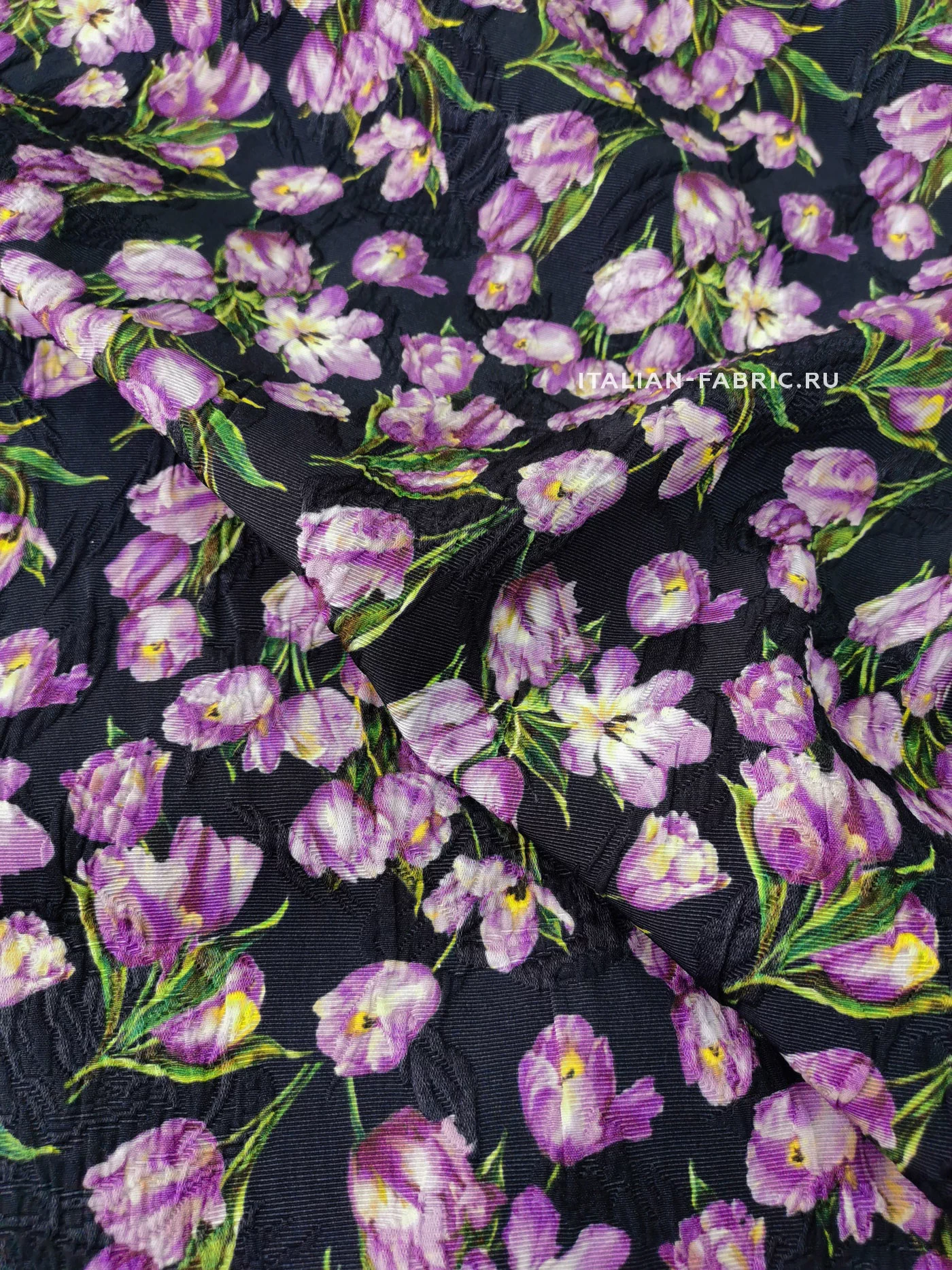 Для самых обворожительных образов рекомендуем жаккард Dolce&Gabbana из шелка и хлопка. Изящные маленькие тюльпаны в нежном фиолетовом цвете придают материалу элегантный и торжественный вид. Чудесный рельеф материи повторяет узор от листьев тюльпанов. Фактура, насыщенный цвет, состав материала – все говорит о самом высоком качестве итальянского жаккарда. Материал приятный тактильно, держит форму, средней плотности. Роскошно смотрится в платьях А-силуэта, платьях-футлярах, жакетах, юбках, костюмных ансамблях, а также легких пальто.