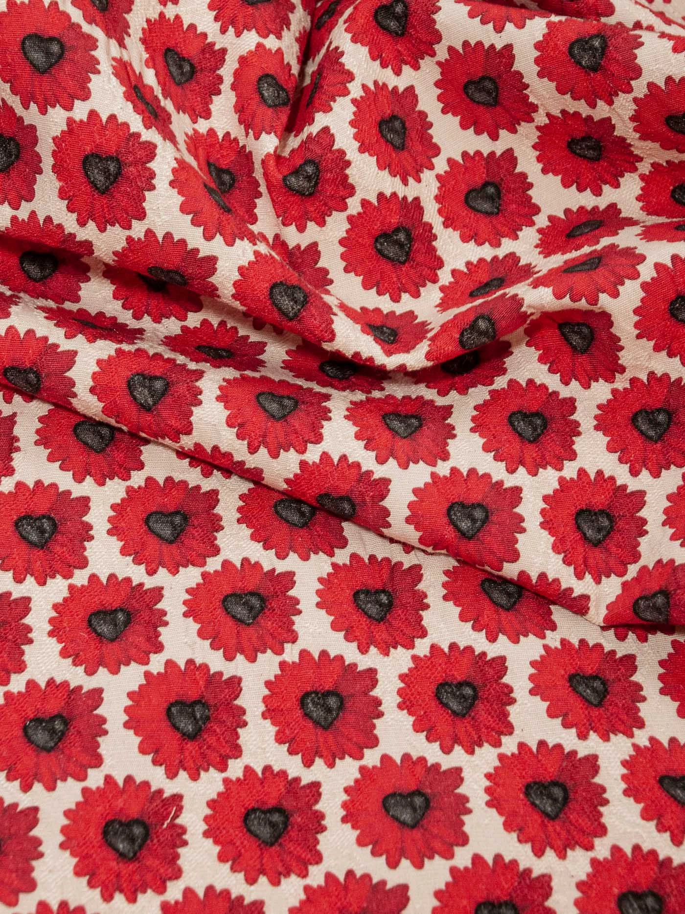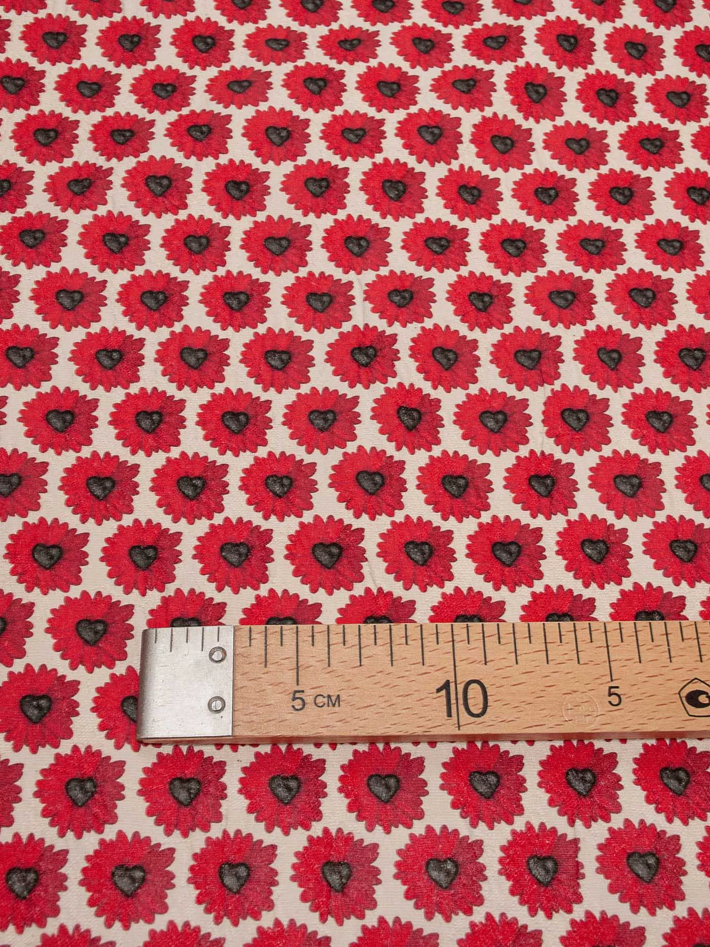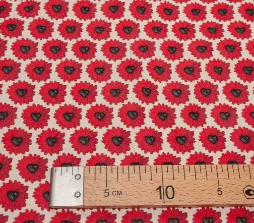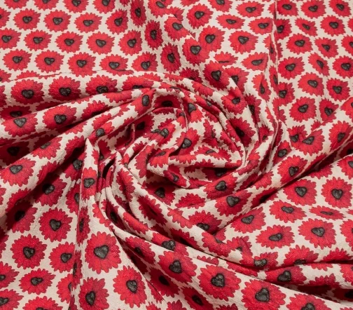 Пластичный, хлопковый жаккард с эффектом креш. Основной фон бежево-молочный. Сердцевинки красных ромашек - черные сердечки!