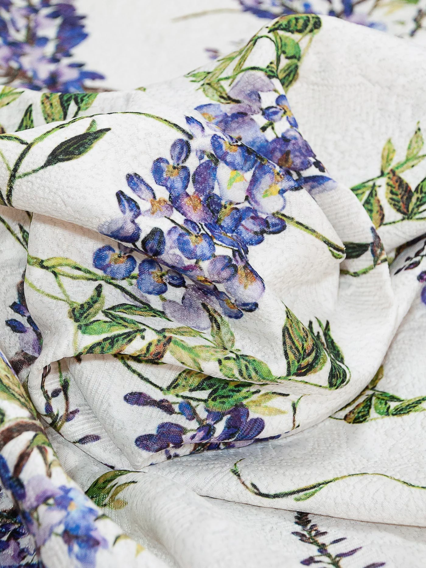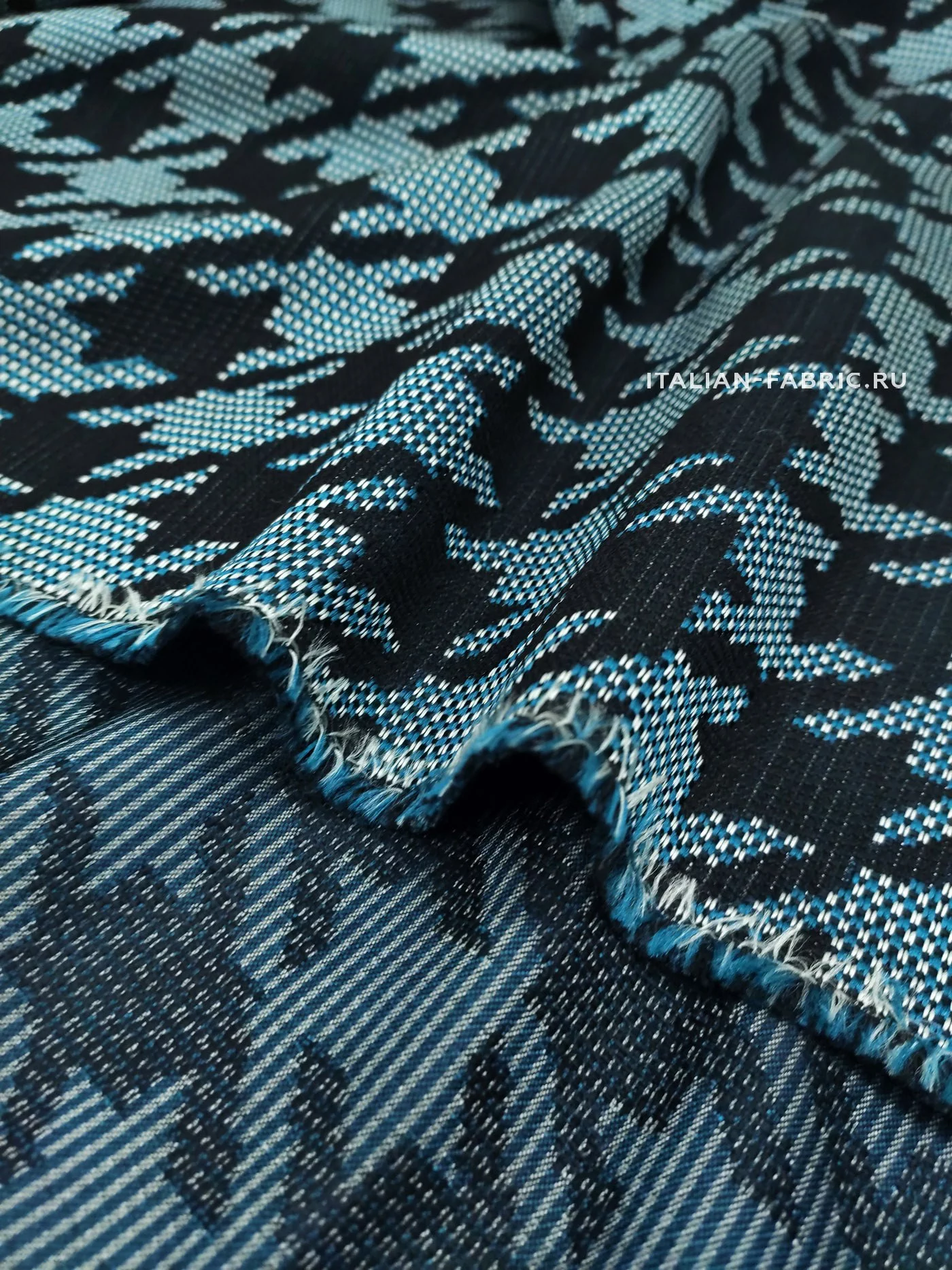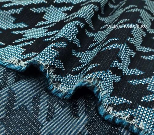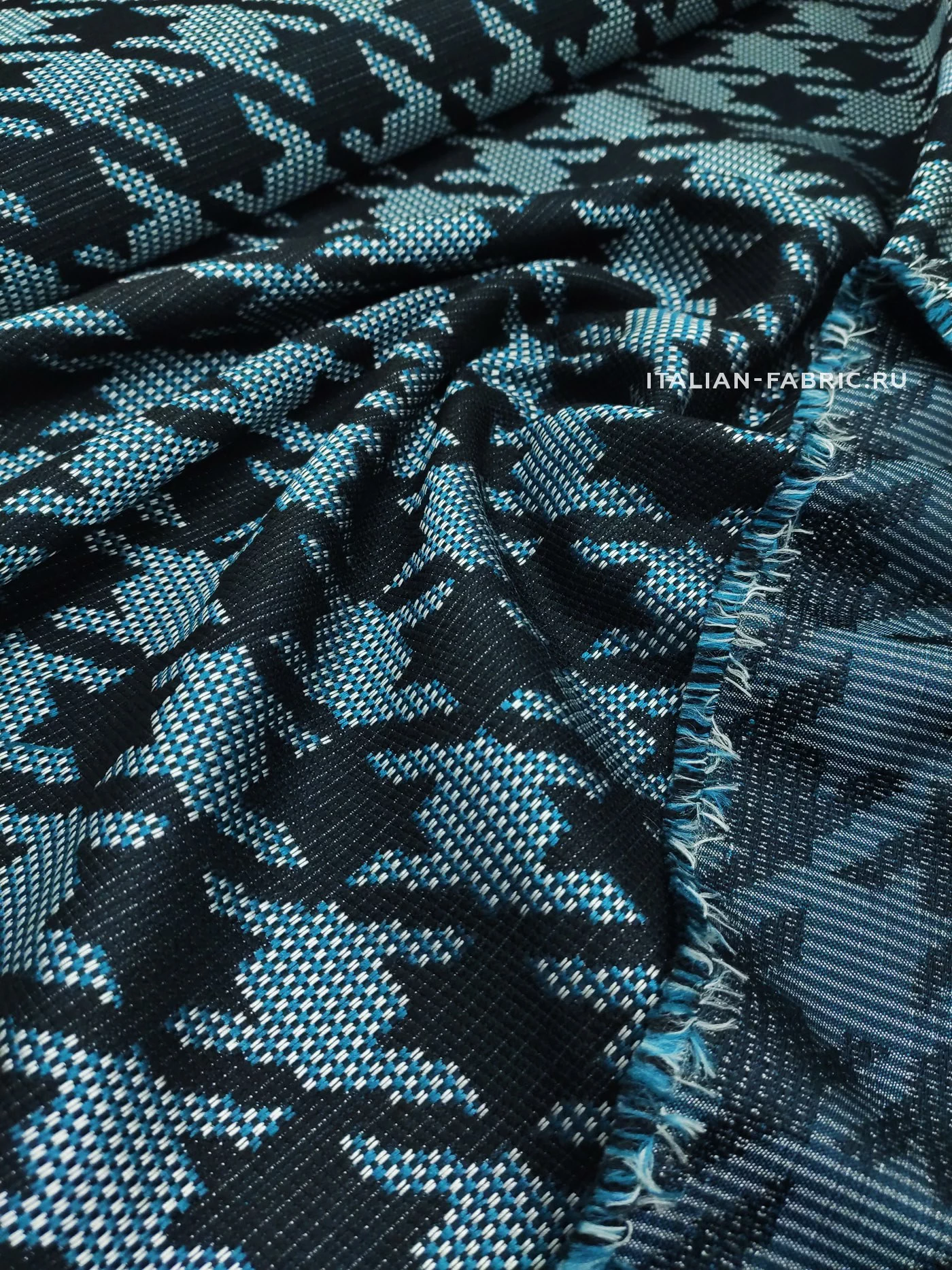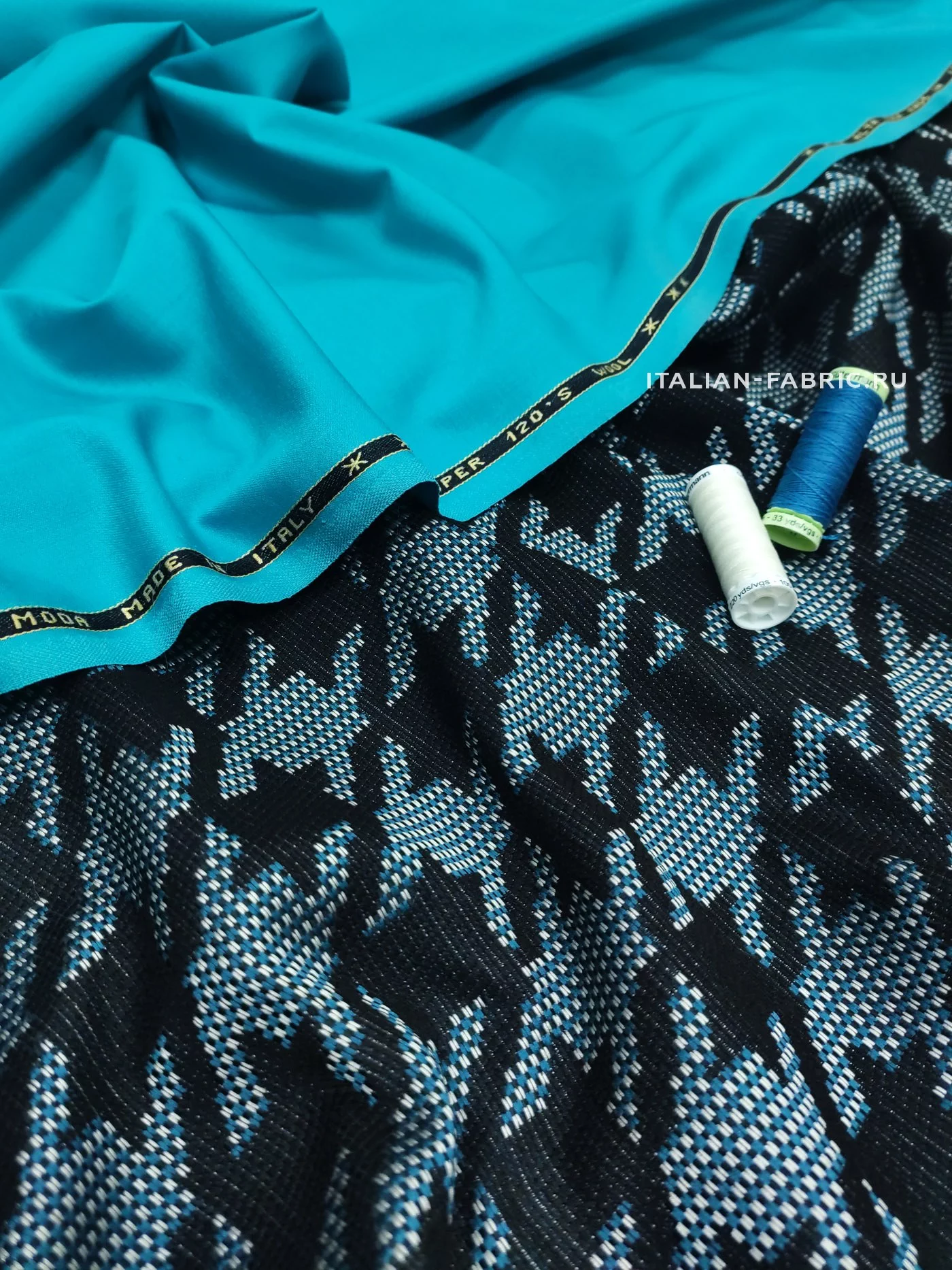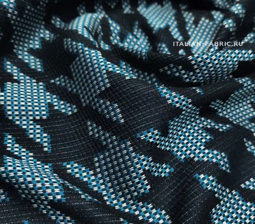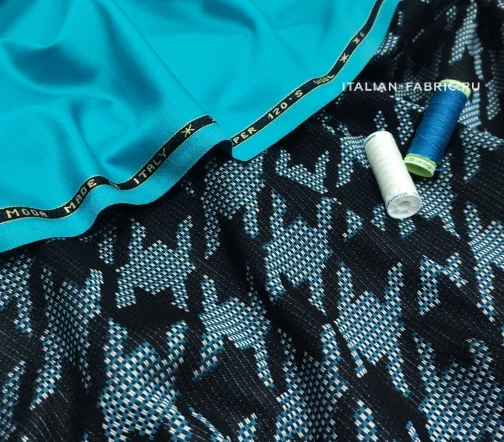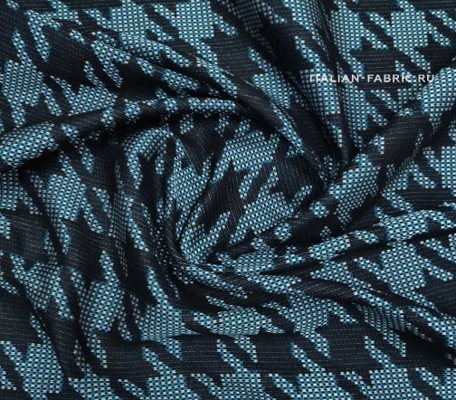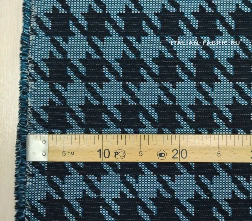 Сегодня дизайнеры по-новому преподносят легендарный узор "собачий клык" и экспериментируют с цветовым решением. Любое изделие из жаккарда с «собачим клыком» в сочетании черного и аквамаринового цветов будет очень эффектным и стильным. Материал с красивым переплетением нитей, мягкий, пластичный, не шуршит. Прекрасно подходит для пошива жакетов, юбок, брюк и платьев. Размер клыка – 5х6 см.