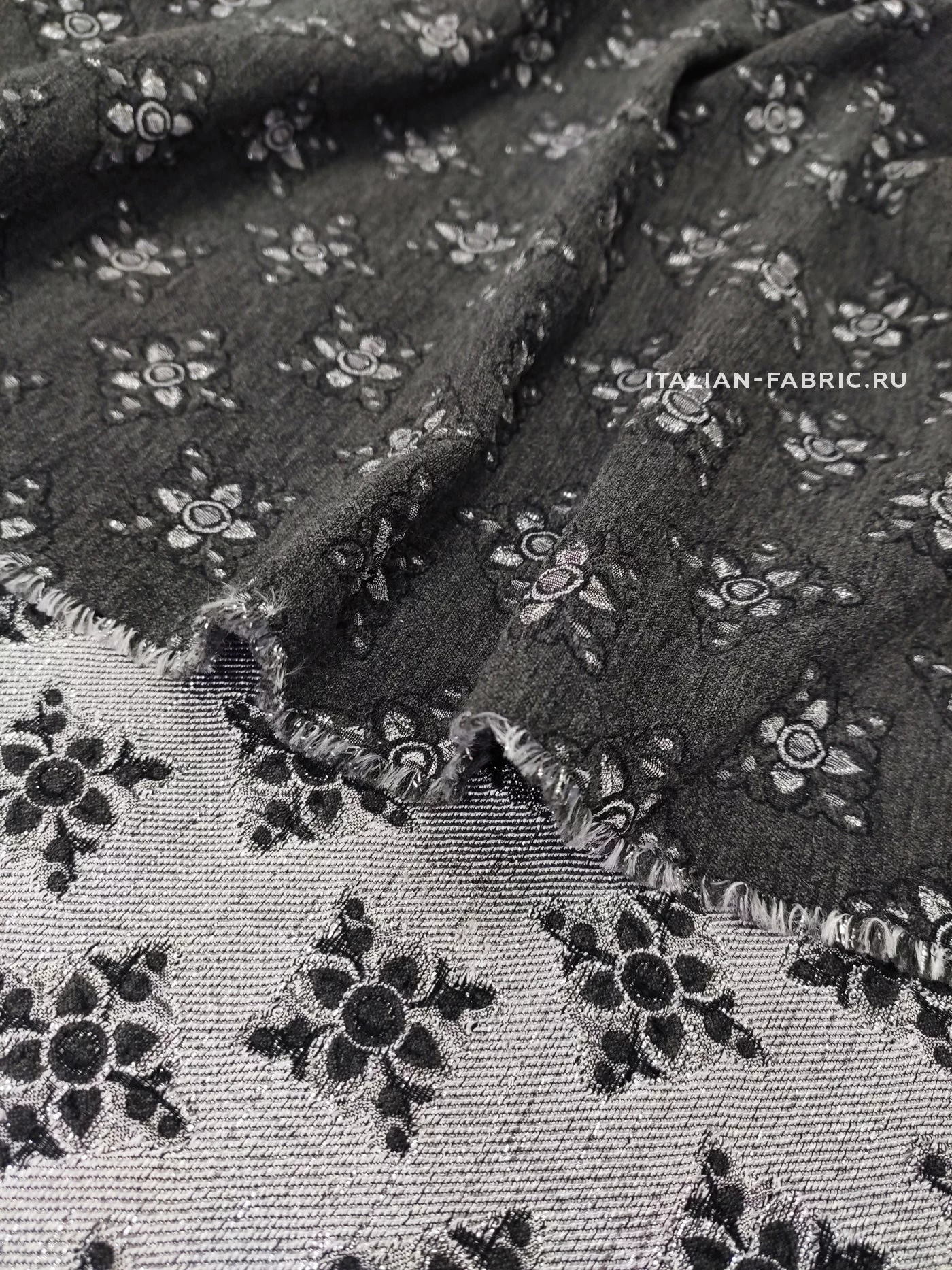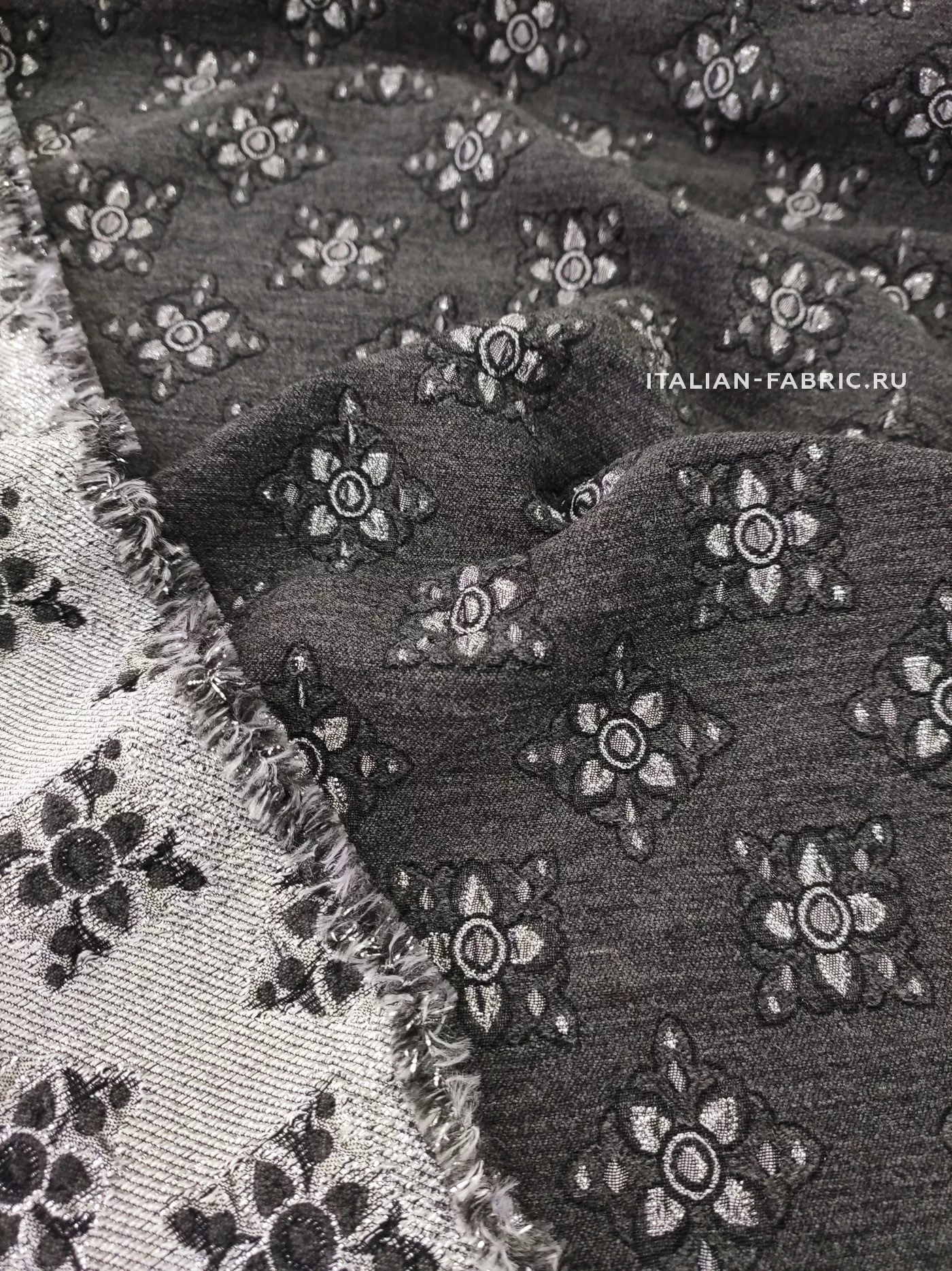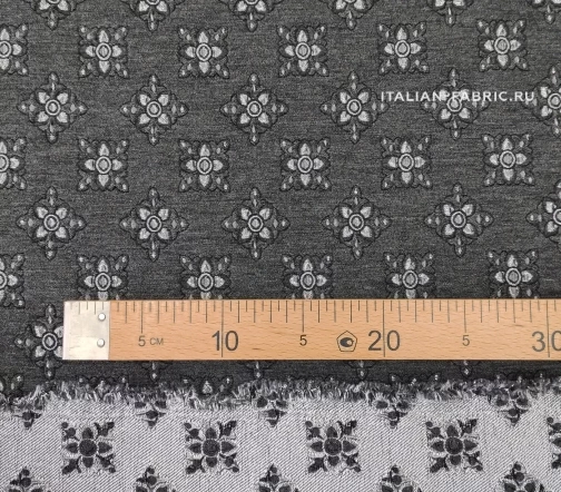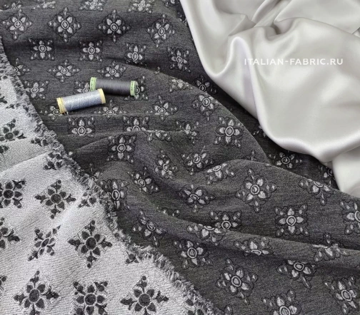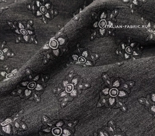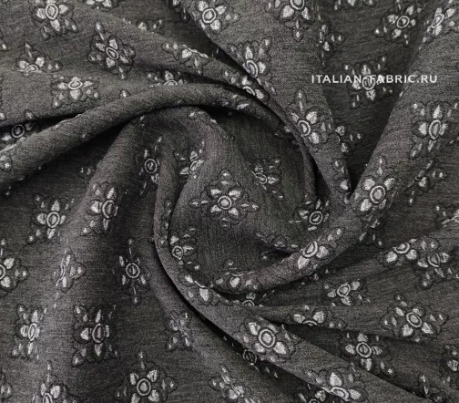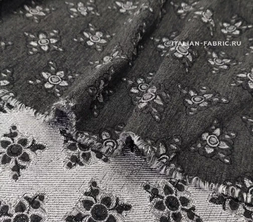 Роскошный жаккард Etro на основе шерсти со стилизованными цветам из нитей люрекса цвета серебра. Изящный узор расположен в шахматном порядке, фон благородного темно-серого цвета, слегка бархатистый за счет выработки. Изнаночная сторона с часто идущими нитями люрекса очень красивая, ее можно интересно обыграть на воротнике, планке или карманах изделия. Материал плотный, шикарно смотрится в любых костюмных ансамблях, юбках, сарафанах и легких пальто.