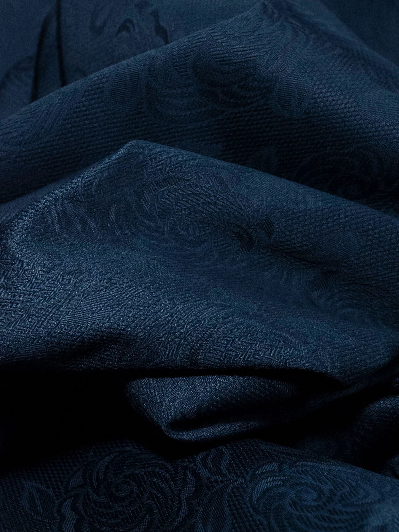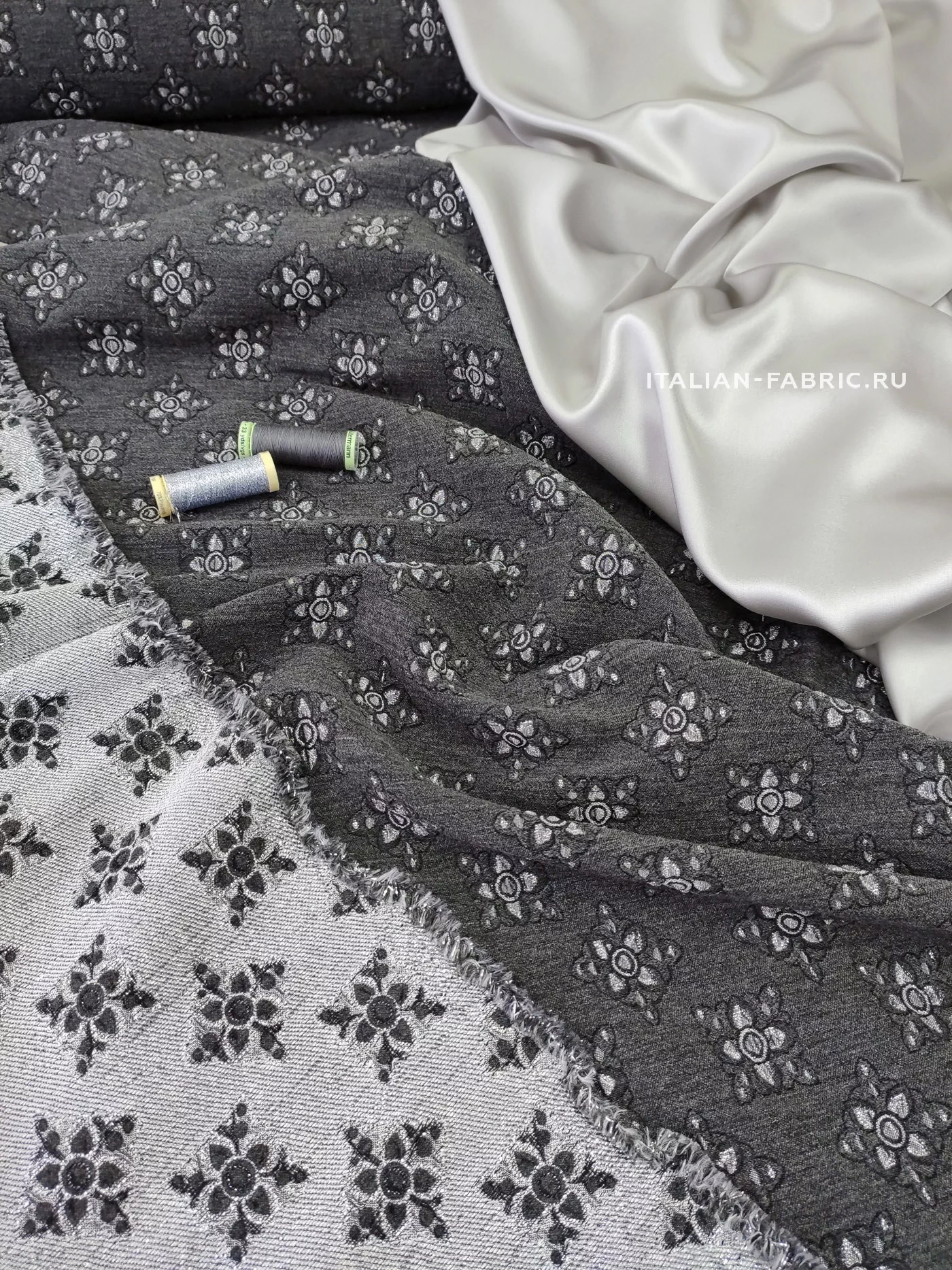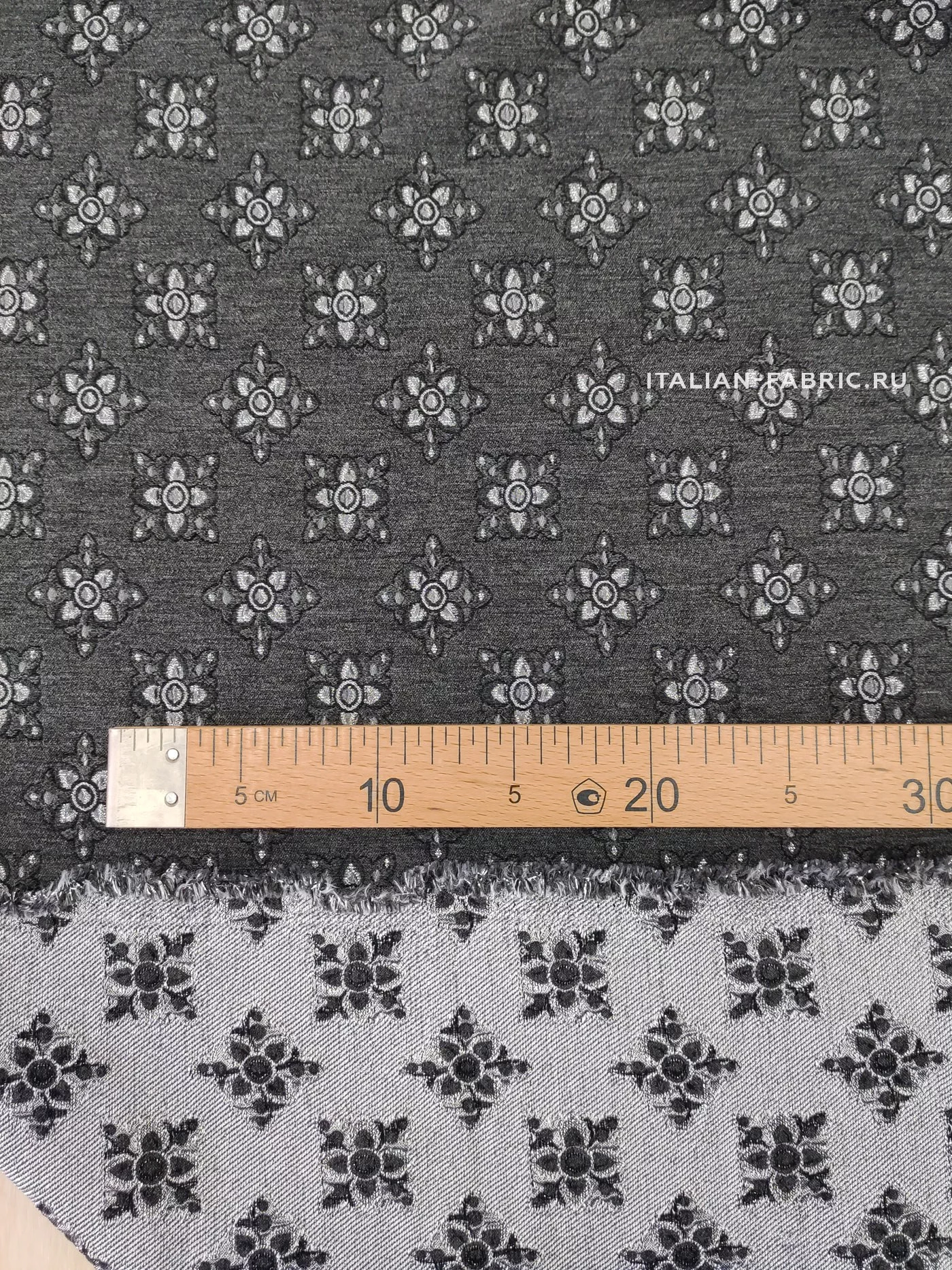 Роскошный жаккард Etro на основе шерсти со стилизованными цветам из нитей люрекса цвета серебра. Изящный узор расположен в шахматном порядке, фон благородного темно-серого цвета, слегка бархатистый за счет выработки. Изнаночная сторона с часто идущими нитями люрекса очень красивая, ее можно интересно обыграть на воротнике, планке или карманах изделия. Материал плотный, шикарно смотрится в любых костюмных ансамблях, юбках, сарафанах и легких пальто.