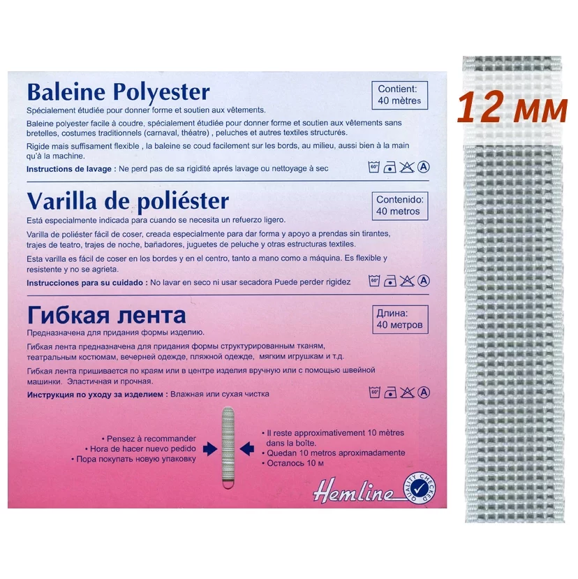 Гибкая лента для придания формы структурированным тканям, театральным костюмам, вечерней и пляжной одежде, мягким игрушкам и т.д. Пришивается по краям или в центре изделия вручную или с помощью швейной машины. Эластичная и прочная. Требуется влажная или сухая чистка.