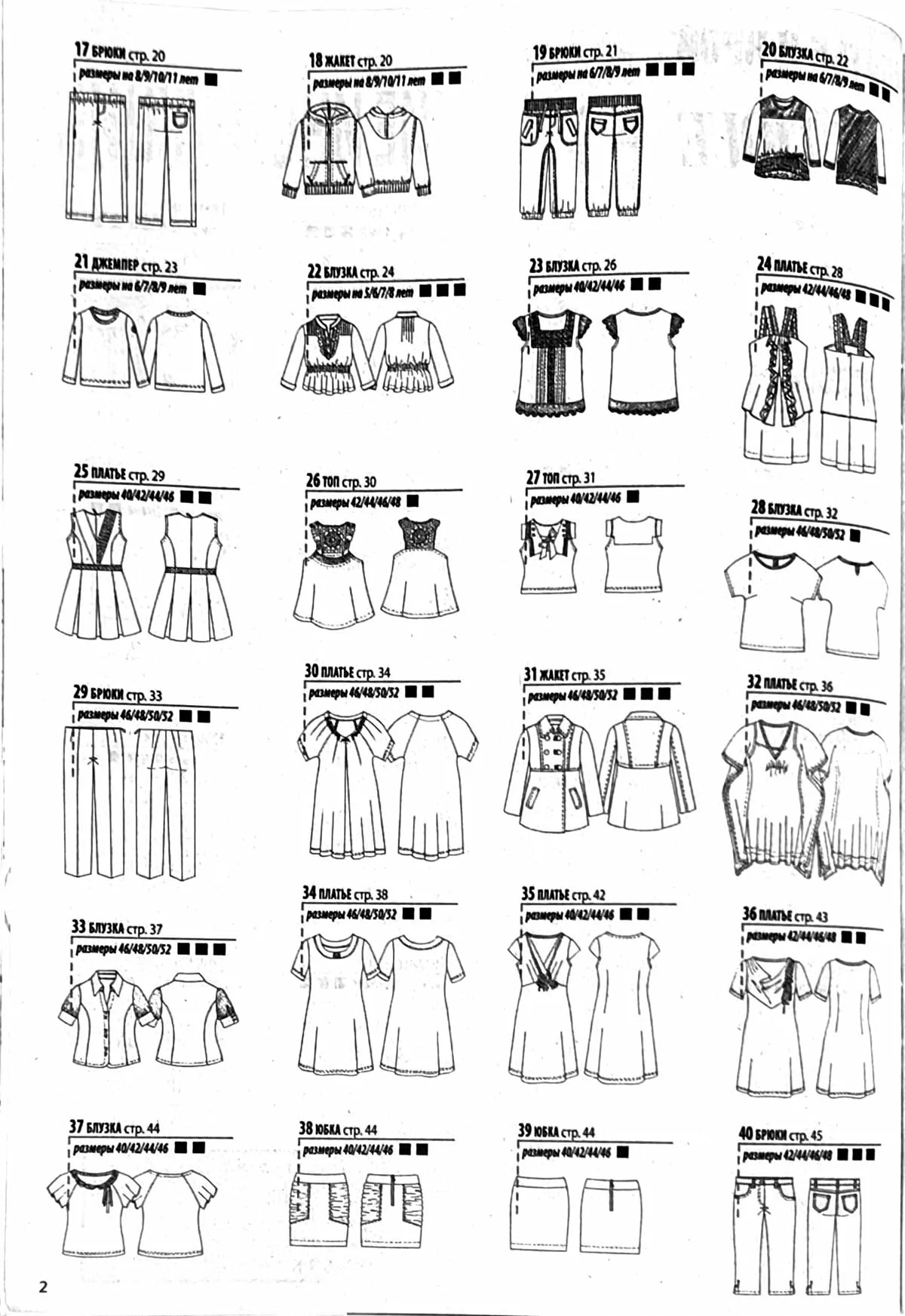 Для моделей, в зависимости от рубрики, предлагаются выкройки размеров – с 38-го по 54-й (размеры IT). Также есть специальный раздел с актуальной модой для детей. Все модели сопровождаются выкройками и подробными инструкциями по шитью.