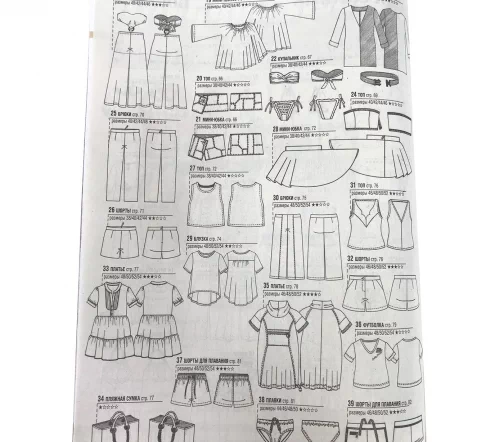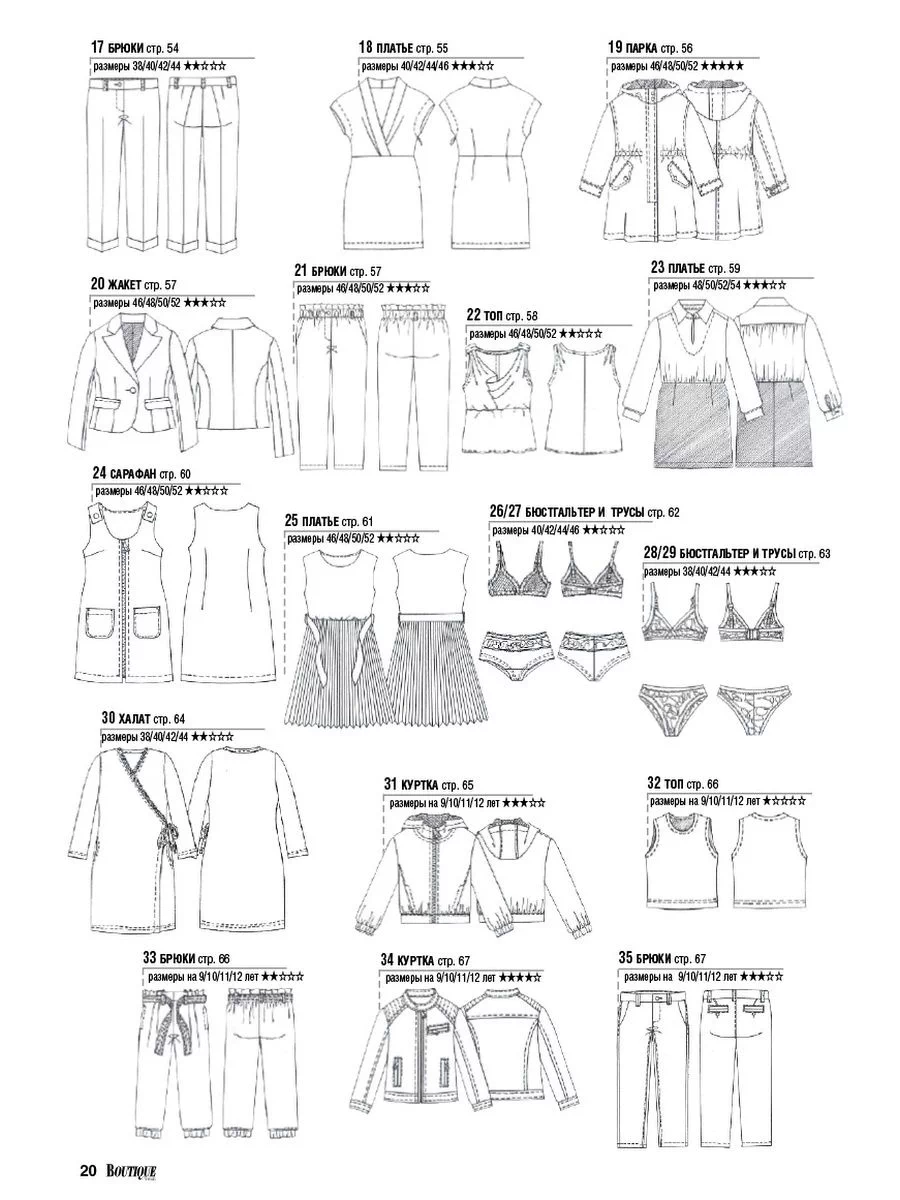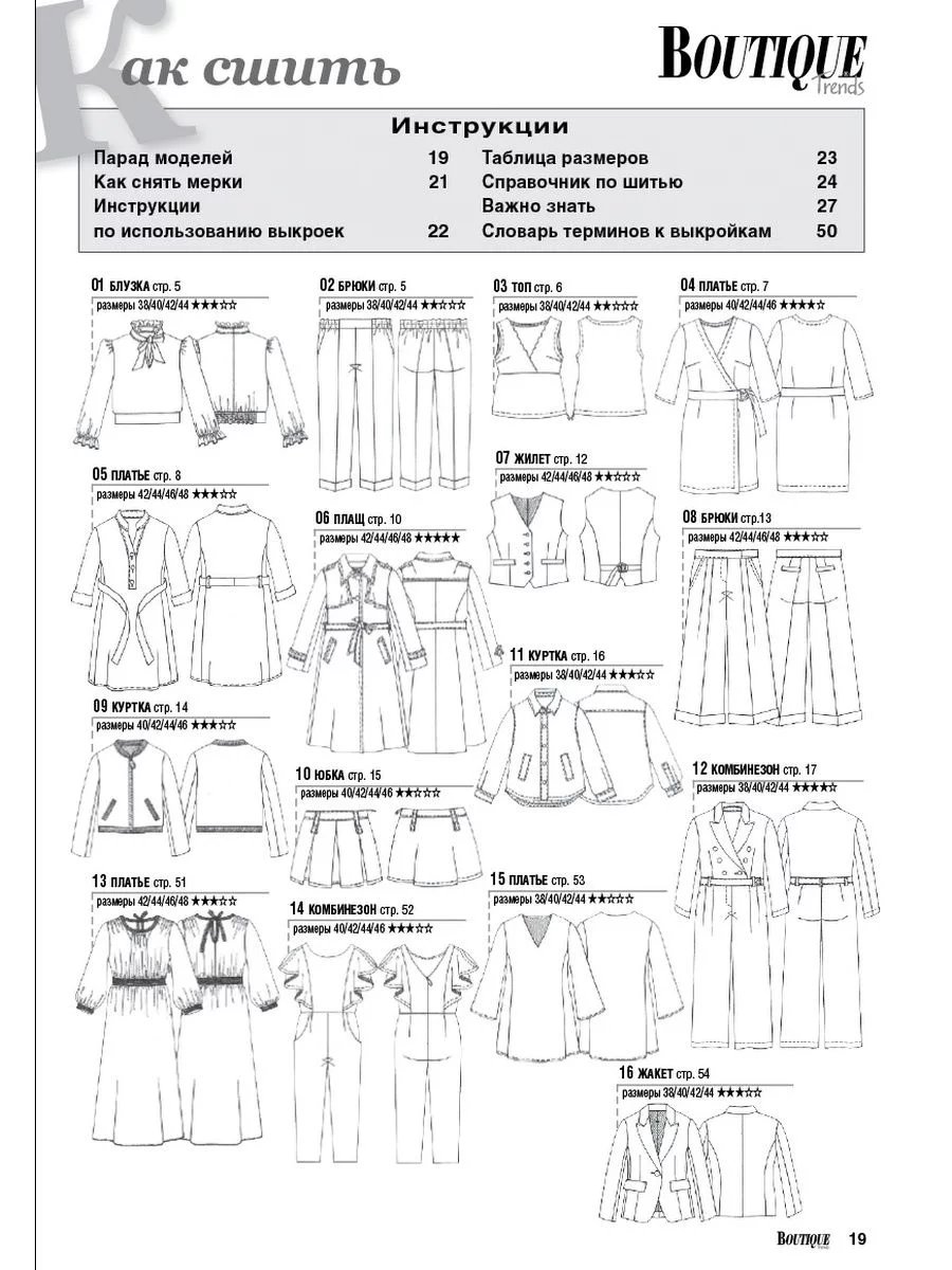 Для моделей, в зависимости от рубрики, предлагаются выкройки размеров – с 38-го по 54-й (размеры IT). Также есть специальный раздел с актуальной модой для