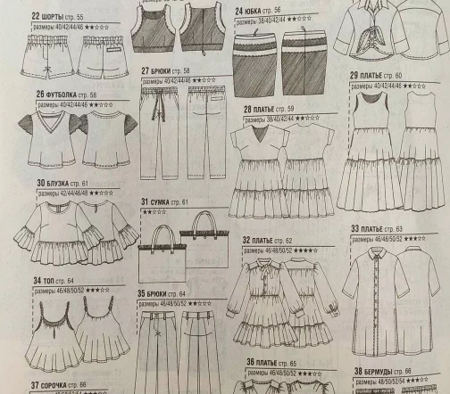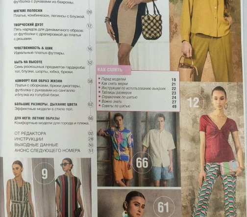 Для моделей, в зависимости от рубрики, предлагаются выкройки размеров – с 38-го по 54-й (размеры IT). Также есть специальный раздел с актуальной модой для детей. Все модели сопровождаются выкройками и подробными инструкциями по шитью.