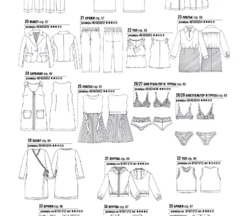 Для моделей, в зависимости от рубрики, предлагаются выкройки размеров – с 38-го по 54-й (размеры IT). Также есть специальный раздел с актуальной модой для детей. Все модели сопровождаются выкройками и подробными инструкциями по шитью.