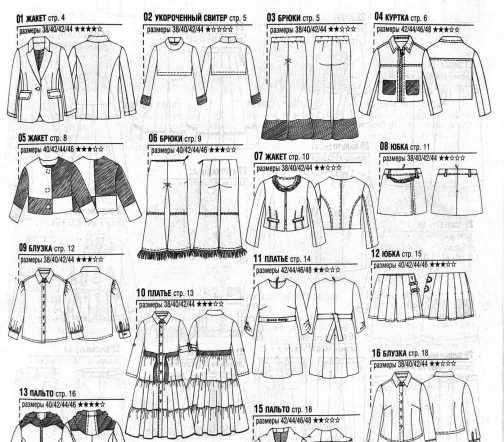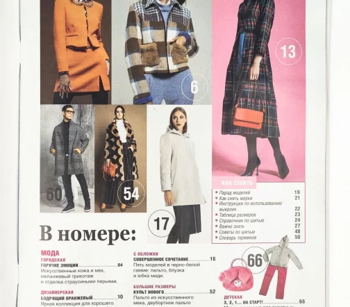 Для моделей, в зависимости от рубрики, предлагаются выкройки размеров – с 38-го по 54-й (размеры IT). Также есть специальный раздел с актуальной модой для детей. Все модели сопровождаются выкройками и подробными инструкциями по шитью.
