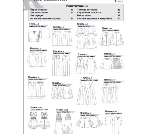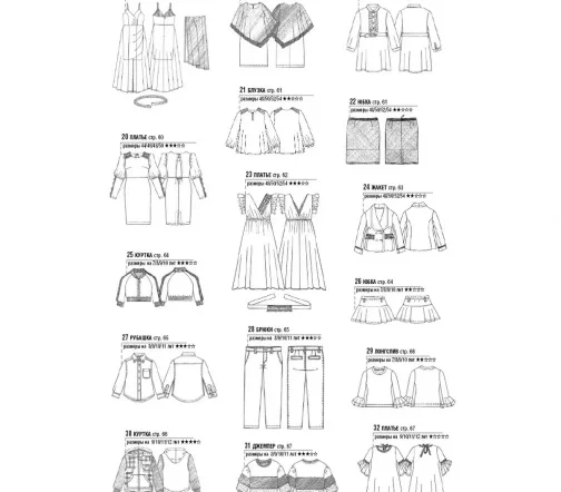 Для моделей, в зависимости от рубрики, предлагаются выкройки размеров – с 38-го по 54-й (размеры IT). Также есть специальный раздел с актуальной модой для детей. Все модели сопровождаются выкройками и подробными инструкциями по шитью.