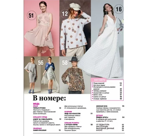 В номере. В первом весеннем номере найдете 32 предложения, включая несколько нарядов для торжественных случаев и два роскошных свадебных платья. Автор этих изделий - итальянский дизайнер Роберто Виоли. Платья не простые, но благодаря инструкциям журнала, в них нет ничего невыполнимого. Также в номере представлены изделия, которые сможет сшить даже новичок, например платье-футляр (стр. 54 журнала). В комплект к платью - жакет. Детская мода. 8 нарядов для мальчиков и девочек (7-12 лет).